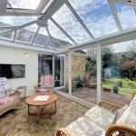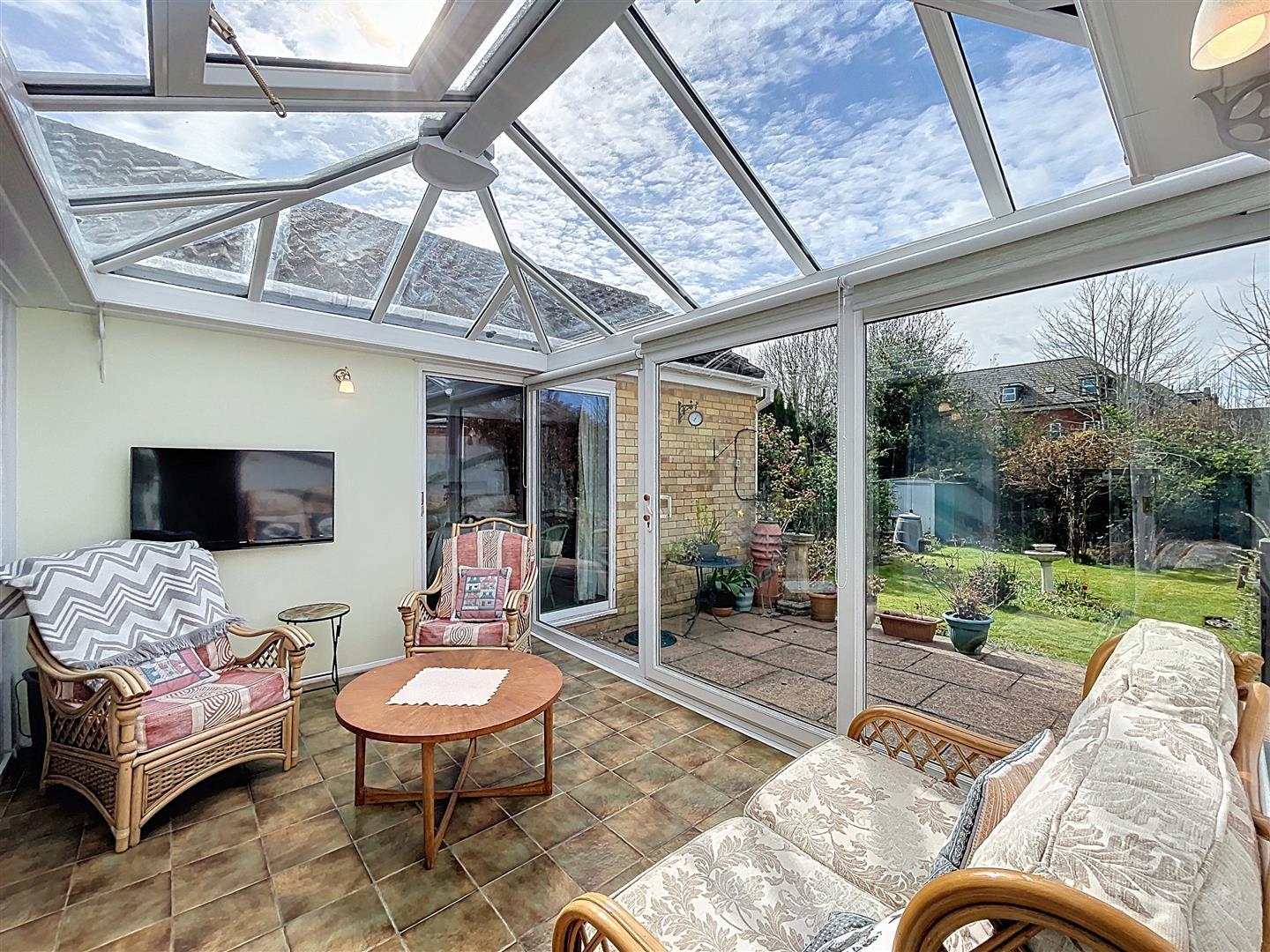 With a pitched glazed roof, windows and door with fitted blinds to the rear overlooking the garden, wall lights, power and light connected with tv point. Archway through to