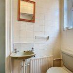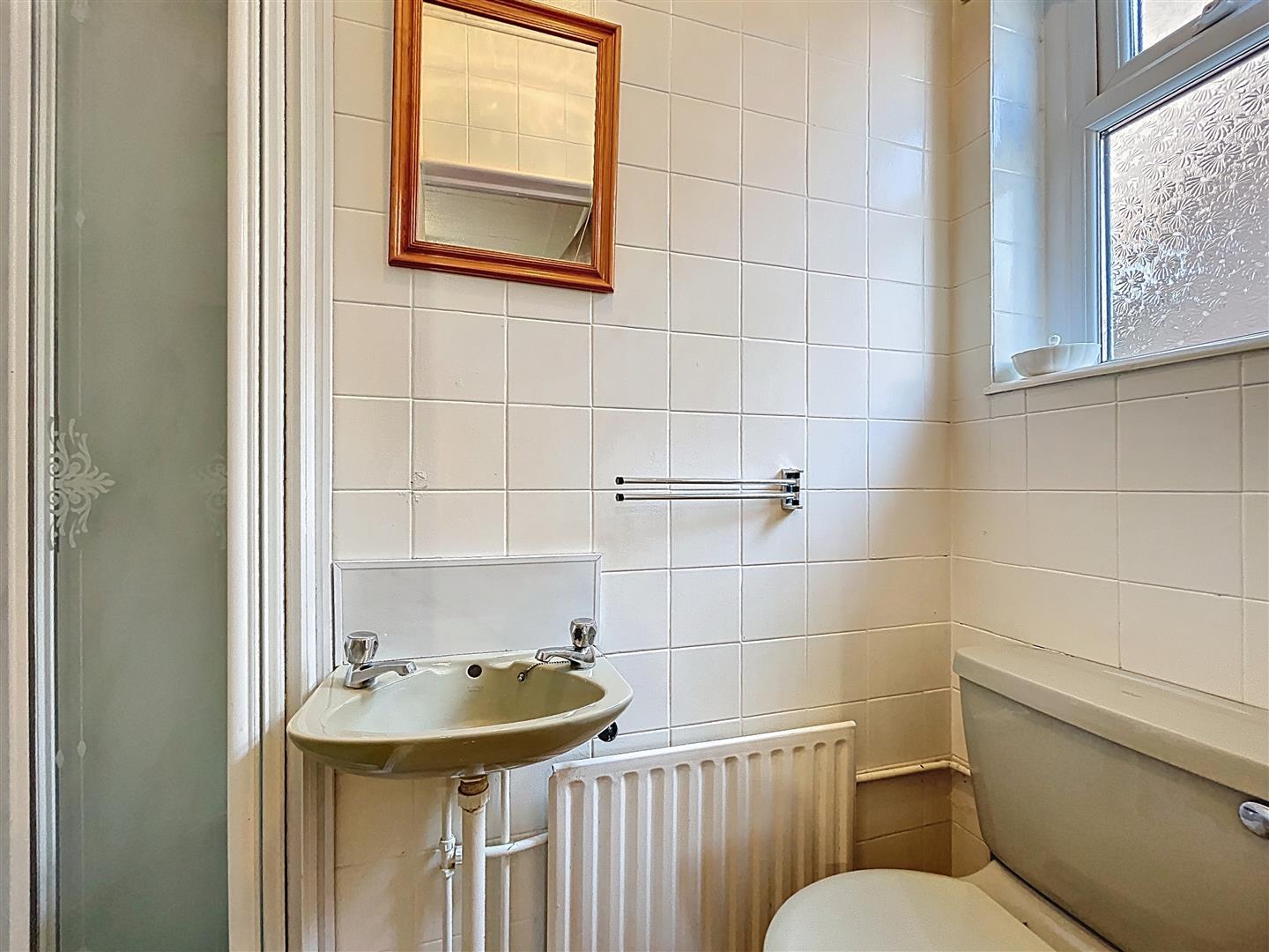 with opaque glazed window, to the side, low level WC, wash hand basin with hot and cold taps, Step in to electric shower unit with splashback and extractor above.