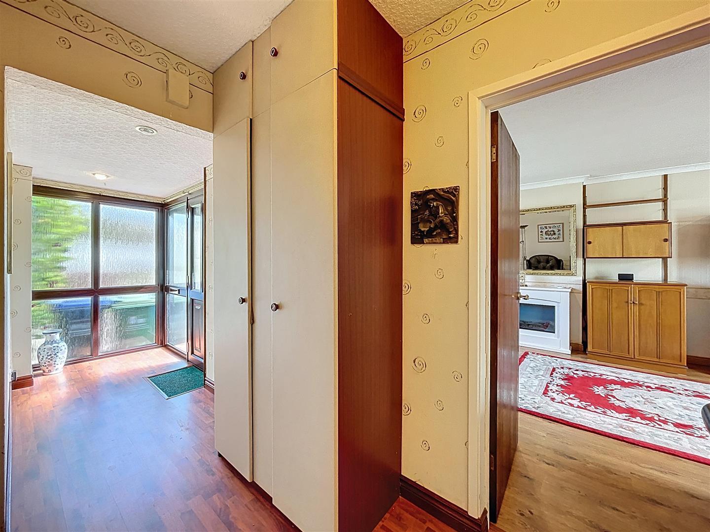 Over bloc pavior driveway allowing for two/three vehicles with graveled fore garden. Step up with grab rails into a enclosed opaque glazed porch, through a composite glazed door into the