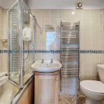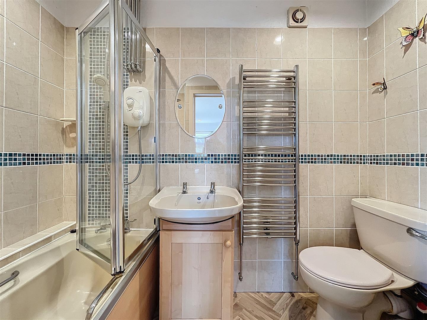 A well-appointed four-piece suite featuring an electric shower over bath with glazed shower screen. The suite comprises a low-level WC and bidet, complemented by full-height ceramic tiling with further benefits including heated chrome towel radiator, inset ceiling downlighters, extractor fan, vanity wash hand basin with cupboard storage below set beneath a mirror, loft hatch access.