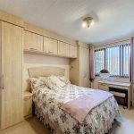 Window to the front elevation with radiator below and array of fitted wardrobes, chest of drawers and overhead storage. Door off to