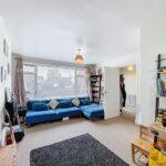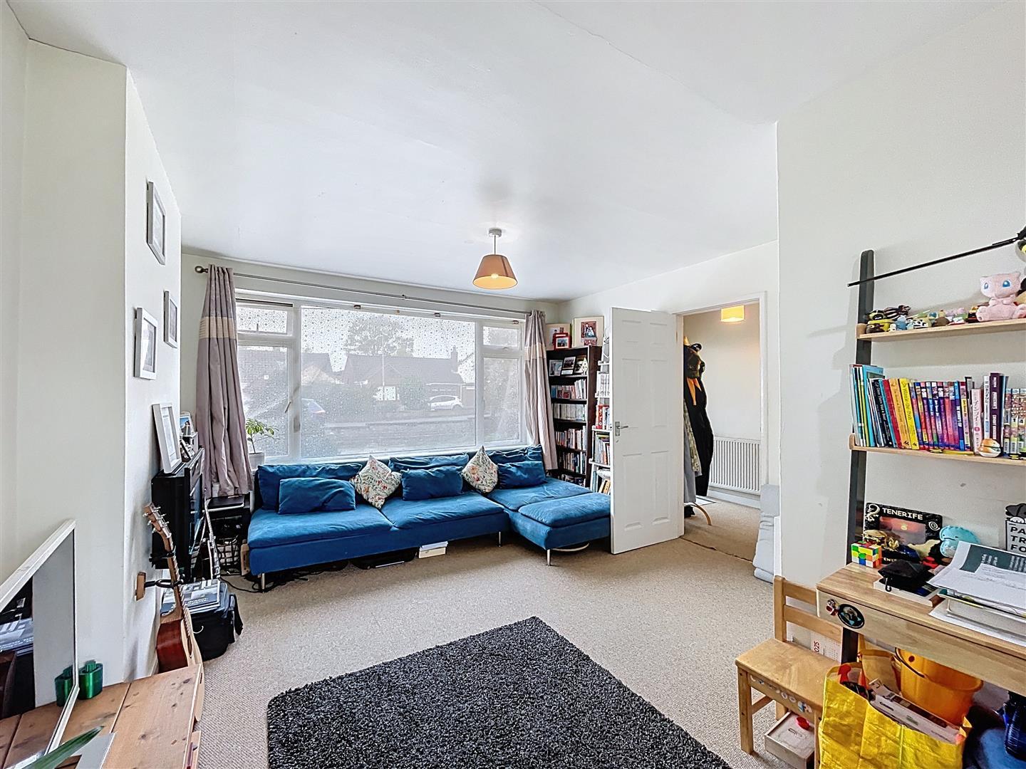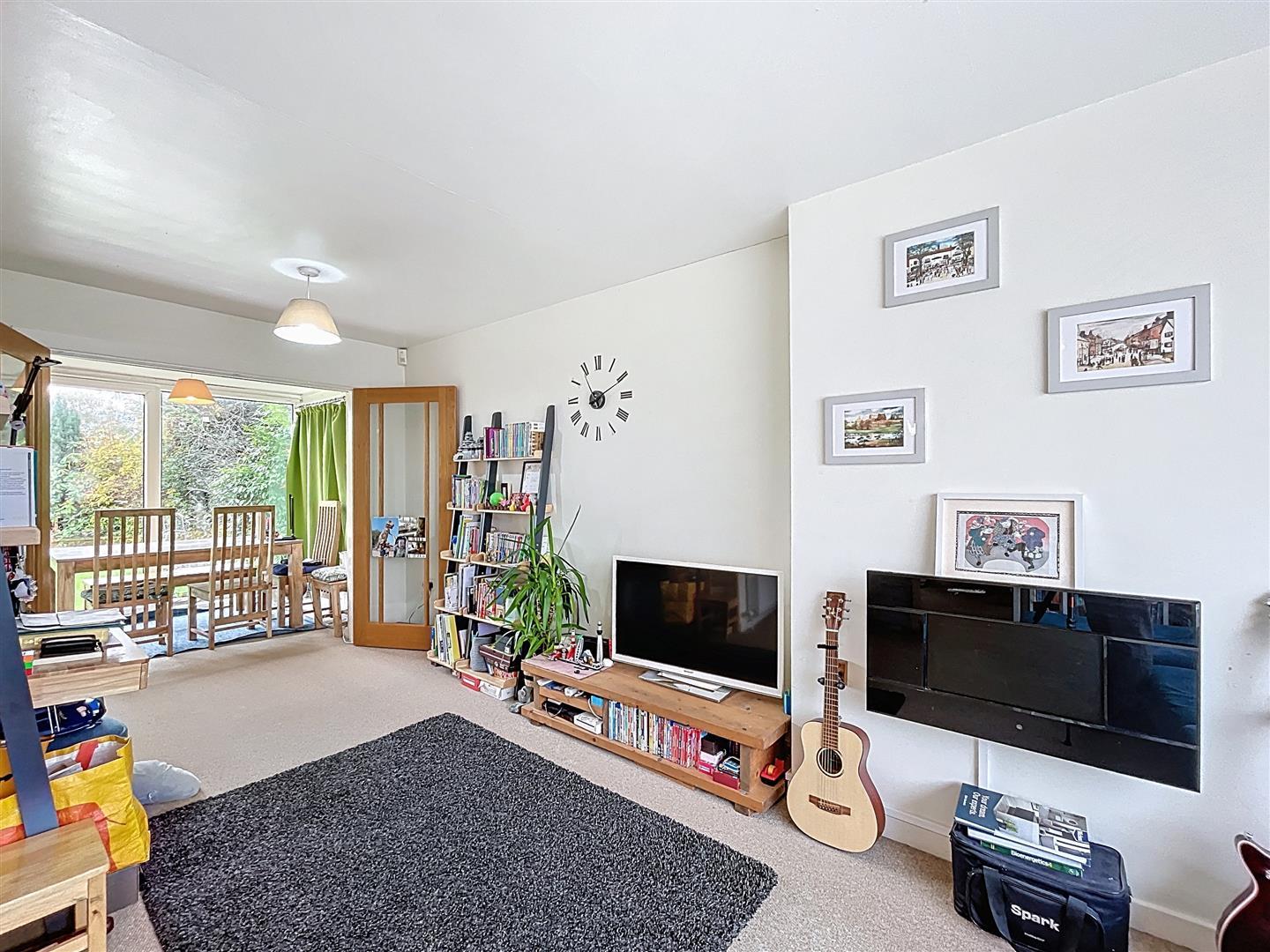 With a wall-mounted electric fireplace, two radiators, and a large picture window at the front, there are oak-glazed internal French doors that lead to the patio doors.