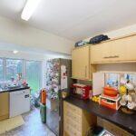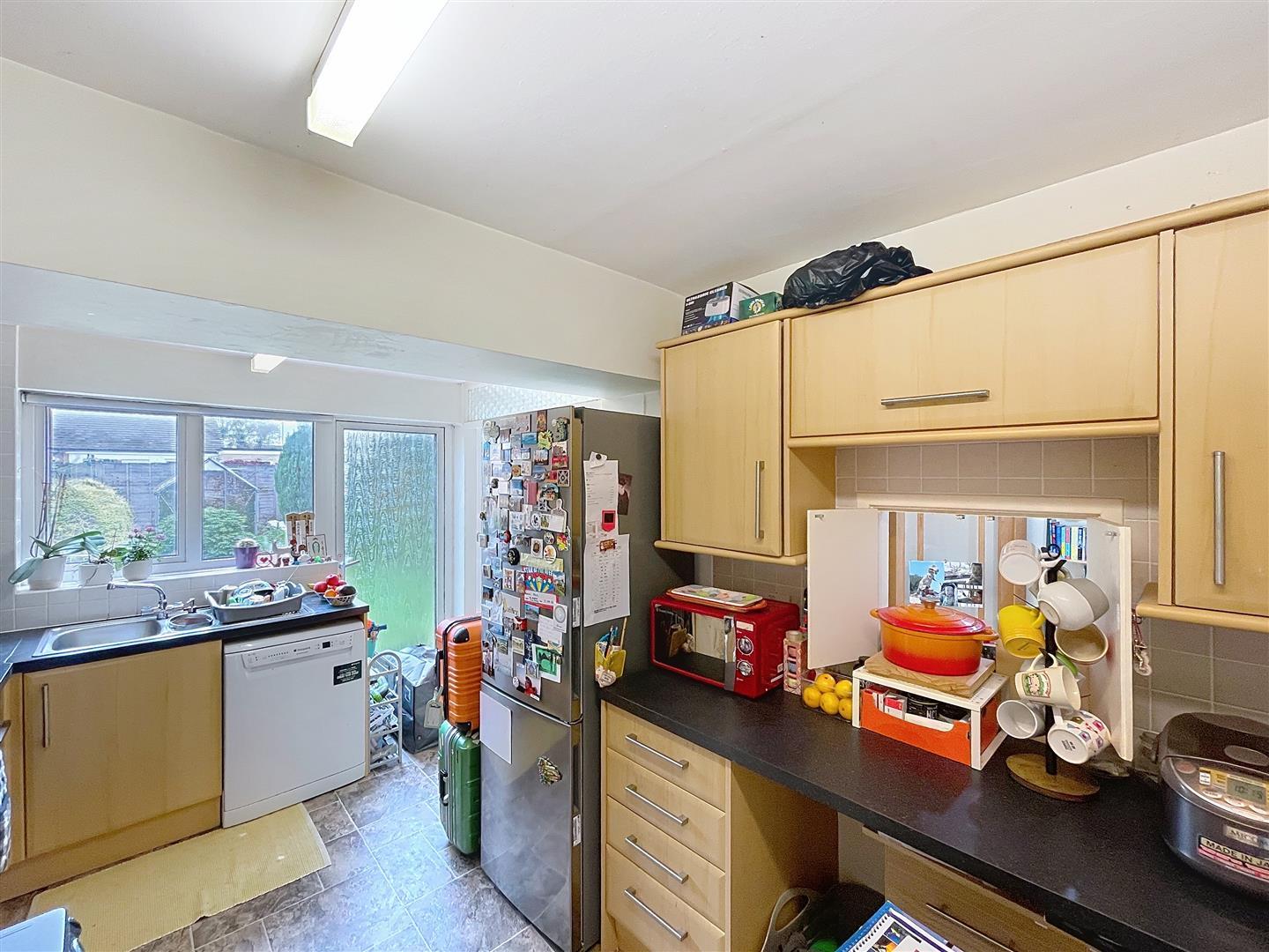 Fitted with a range of matching beech-fronted base and wall units, with marble-effect rounded edge work surfaces and a one-and-a-half bowl stainless steel sink with a chrome mixer tap. It includes a four-ring stainless steel Lamona gas hob with a concealed illuminated extractor hood above, and a single fan-assisted oven below. There is space for a large upright fridge freezer and plumbing for a washing machine. Additional features include a radiator, vinyl flooring, two ceiling strip lights, a window and door leading to the rear garden, a servicing hatch, and a door to the hall.
