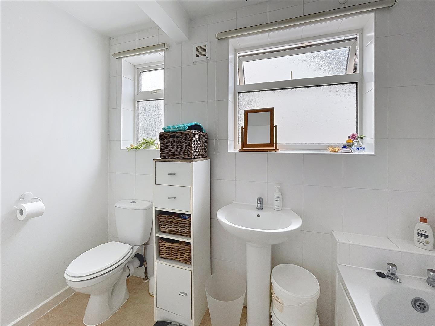 With a three-piece white suite that includes a low-level W.C., a pedestal wash hand basin with a chrome mixer tap, and a panelled bath with grab handles and a mains-fed shower featuring chrome fittings and attachments. The walls are adorned with ceramic tiles, and the space includes a radiator, vinyl flooring, two opaque windows to the side, an extractor fan, and LED downlighters.