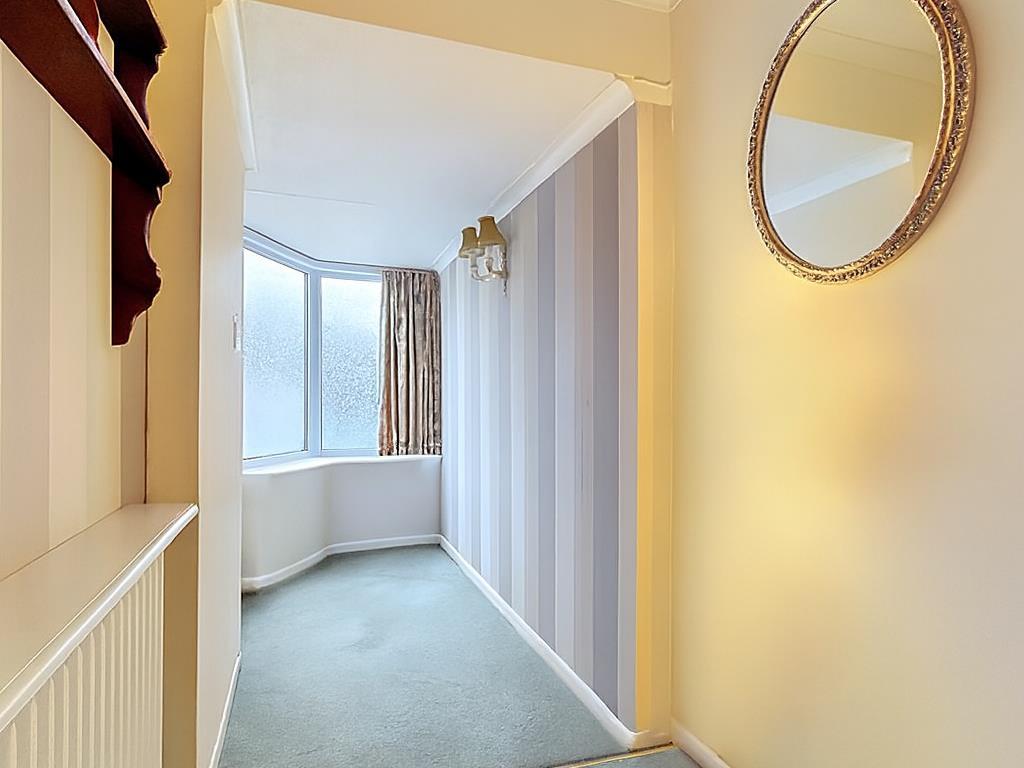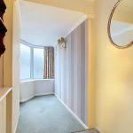 Stepping into a extended hall with opaque glazing with telephone point, central ceiling light, radiator, useful storage cupboard with fitted shelving, access to insulated loft room with power via timber ladder.
