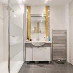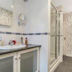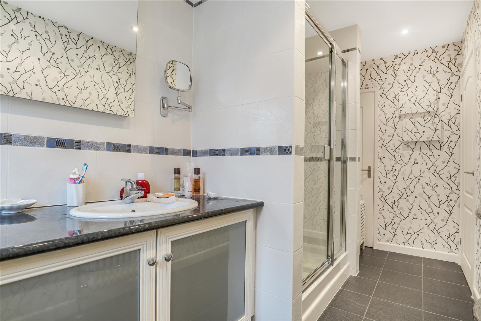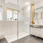 Refitted three-piece white suite featuring a low-level W.C., twin vanity wash basins with cupboards below, and a large walk-in shower enclosure equipped with a mains-fed shower. The walls are ceramic tiled, and there is a glazed fitted shower screen. Additional features include a heated towel rail, black ceramic tiles on the floor, LED downlighters, and an opaque window on the side.