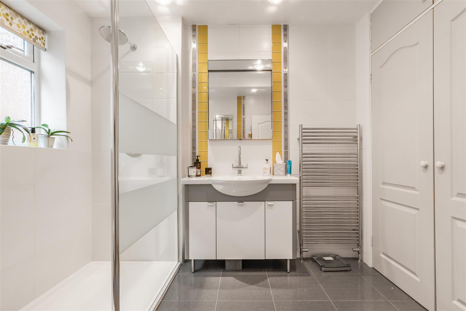The room features a modern three-piece white suite, including a low-level WC and a vanity wash hand basin with a chrome mixer tap and a cupboard underneath. There is a large shower enclosure complete with a fitted glazed screen, a mains-fed shower, and a rain head shower. Additionally, there is a built-in double airing cupboard with slatted shelving, as well as a hot water cylinder with an immersion heater. A mirrored vanity mirror is also included, and there are two opaque windows on the side.
