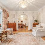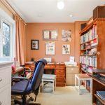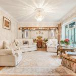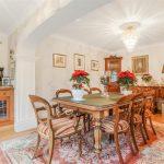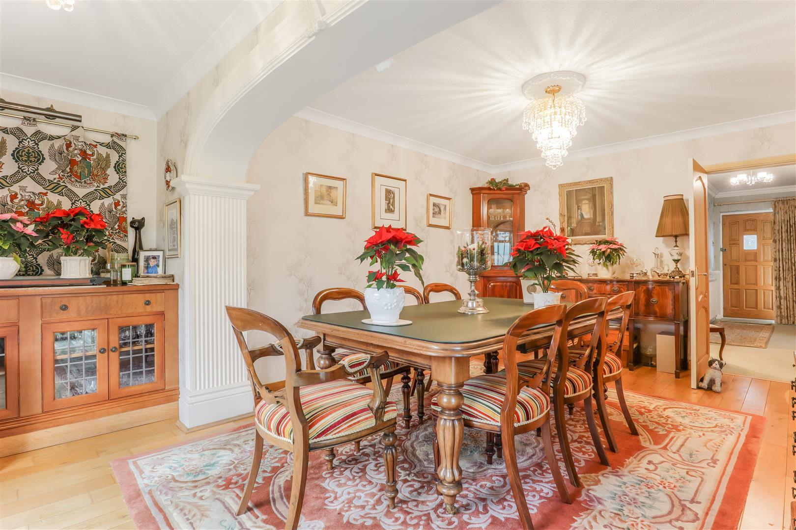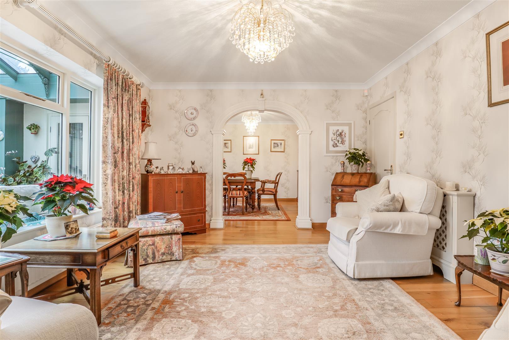 The room features engineered oak flooring, a ceiling light complete with a centre rose, and elegant coving. There is ample space for a large dining table, along with a striking mock Georgian arch flanked by matching pillars. Additionally, the room includes a radiator and window facing the front, a bespoke built-in drinks cabinet, and a picture light. Double doors lead to the conservatory, enhancing the area with further architectural detail provided by the feature arch and pillars.