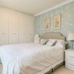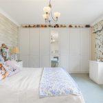 With a window at the rear, a radiator, a ceiling light, LED downlighters, and built-in double wardrobes along one wall with matching cupboards above.