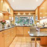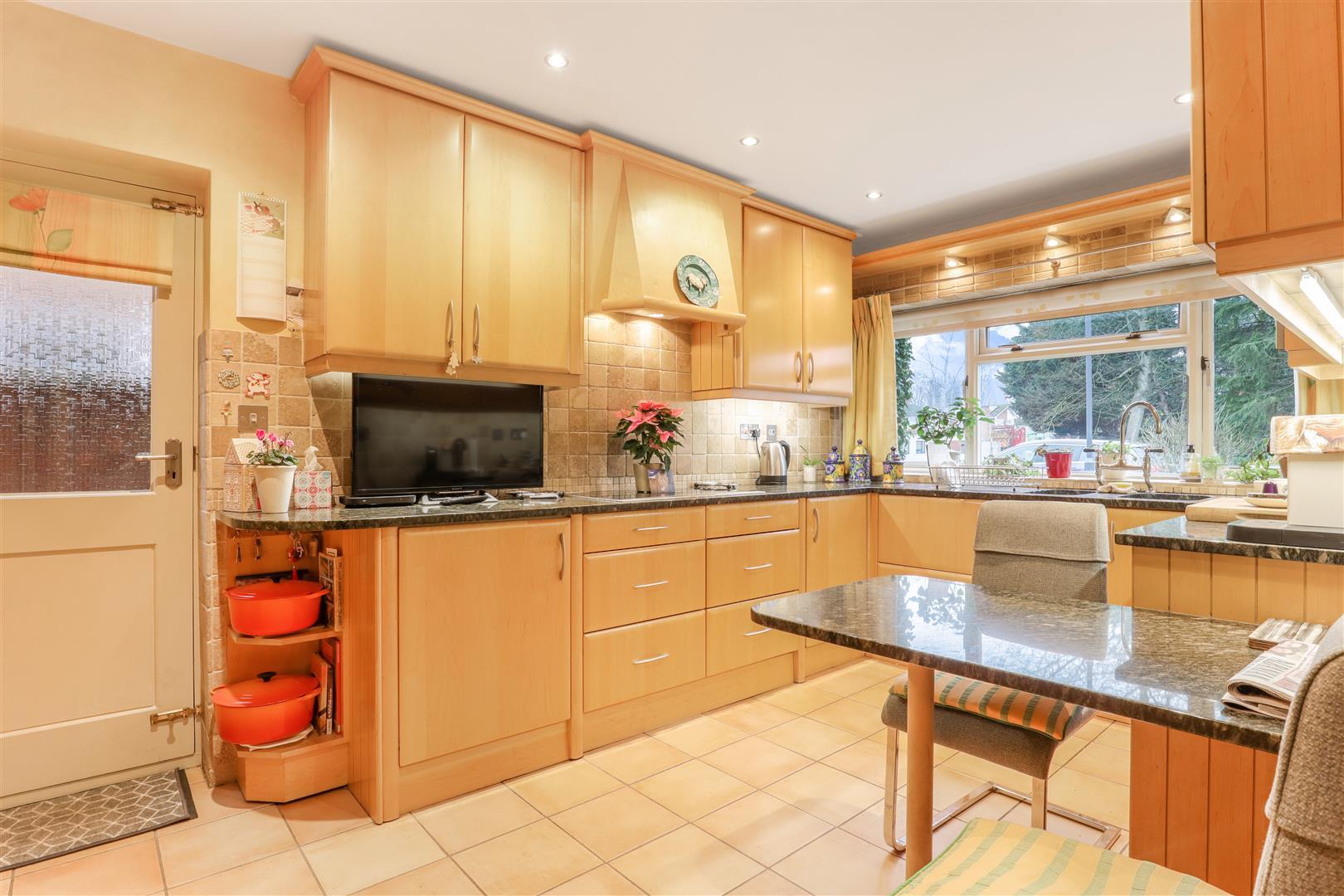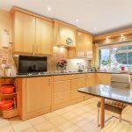The kitchen is comprehensively fitted with a range of matching beech-fronted base and wall units, featuring 30mm granite work surfaces. It includes a double bowl sink with a chrome mixer tap and integrated appliances, such as a Neff oven, a larder undercounter fridge, a Neff microwave, and a Neff five-burner electric halogen hob with an extractor above. The kitchen also features a peninsula breakfast bar, a radiator, a walk-in pantry cupboard, ceiling downlighters, a side door, and a double-glazed window at the front, along with under-pelmet lighting.
