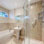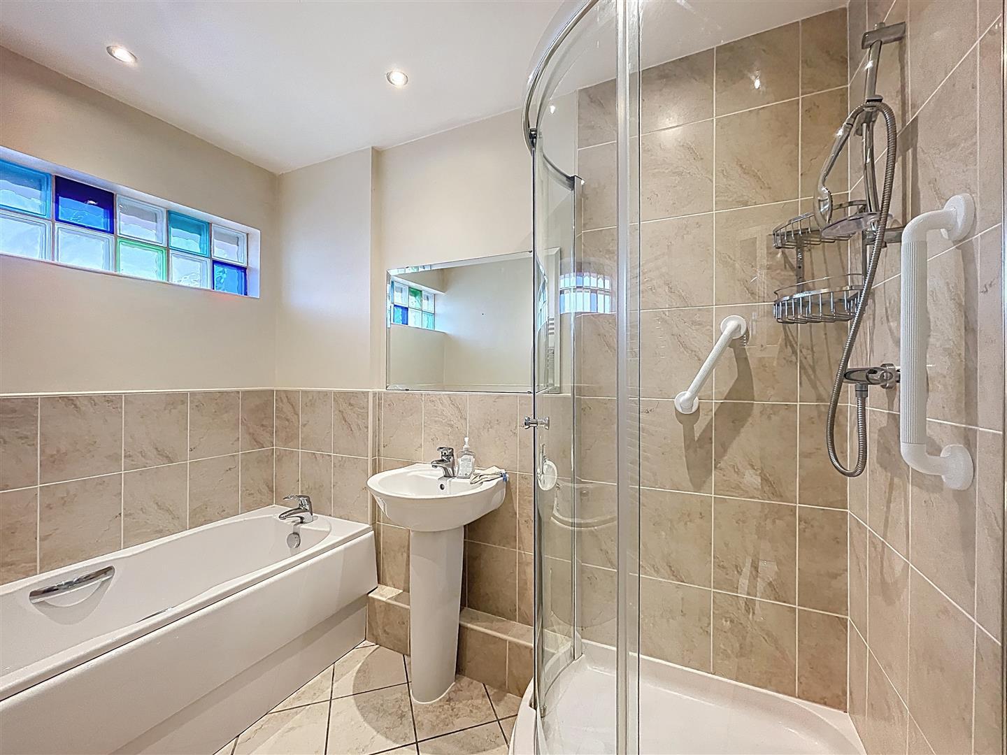 Having a panel bath, pedestal wash and basin, close couple WC and a corner shower cubicle with a thermostatic shower. Tiling to splashback and floor, radiator and heated towel rail. Window to the side and a medicine cabinet.