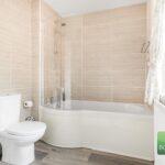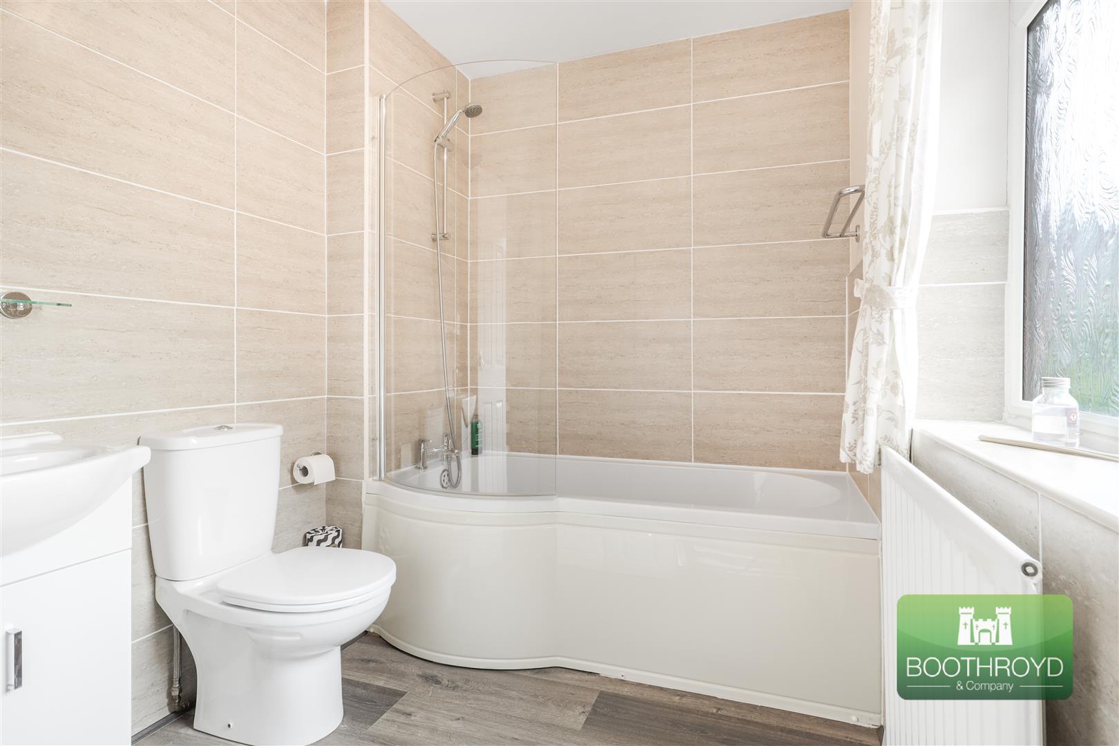 Fitted with a corner shower cubicle with a thermostatic shower, pedestal wash hand basin and a close coupled wc. Heated towel rail and a window to the side.