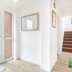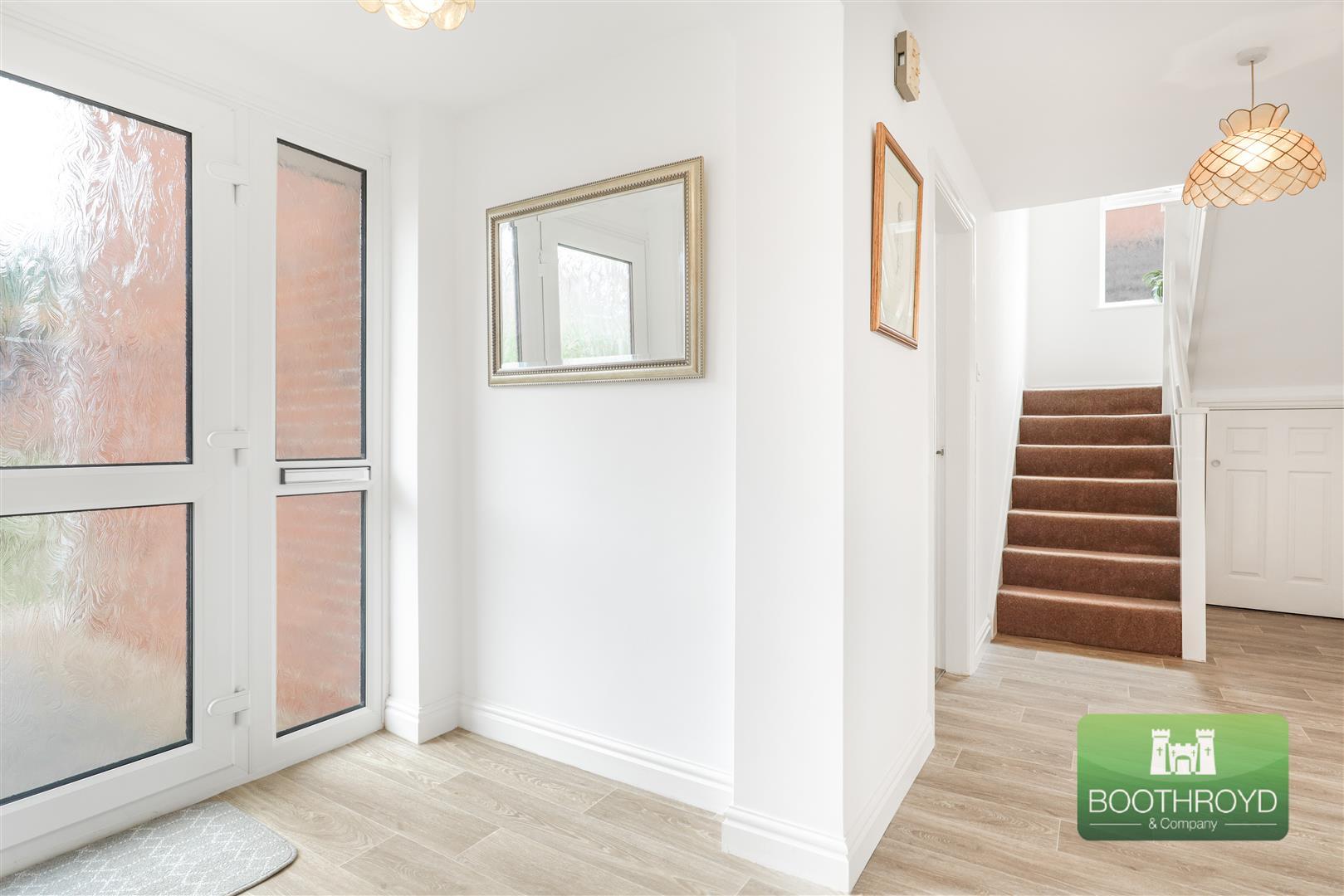 The property is approached across a paved pathway that is flanked by open plan formal lawns. Accessed through an obscure door that leads into the entrance hallway