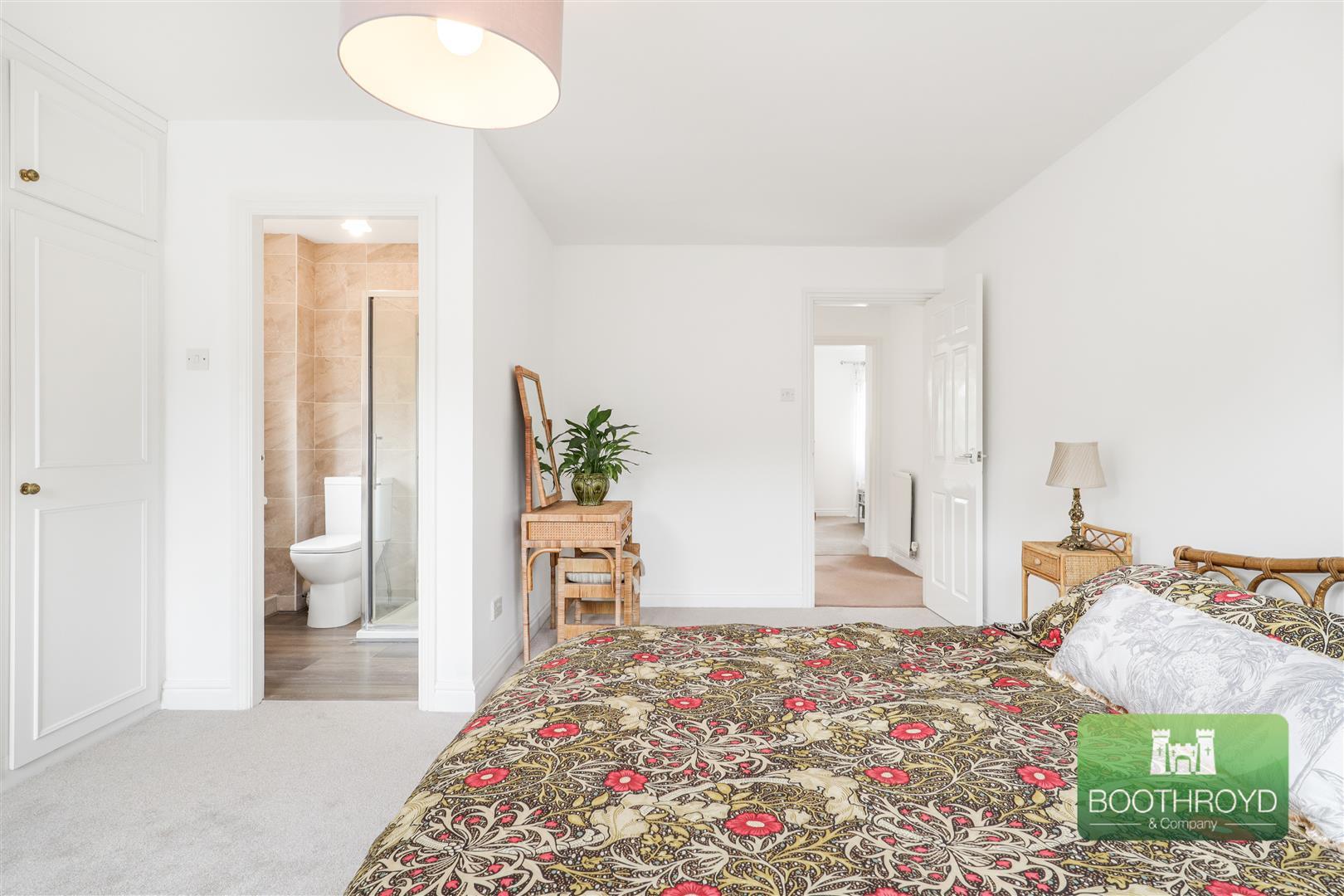 With twin windows to the fore, radiator and built in wardrobes to one wall and a door into the en-suite shower room.