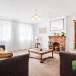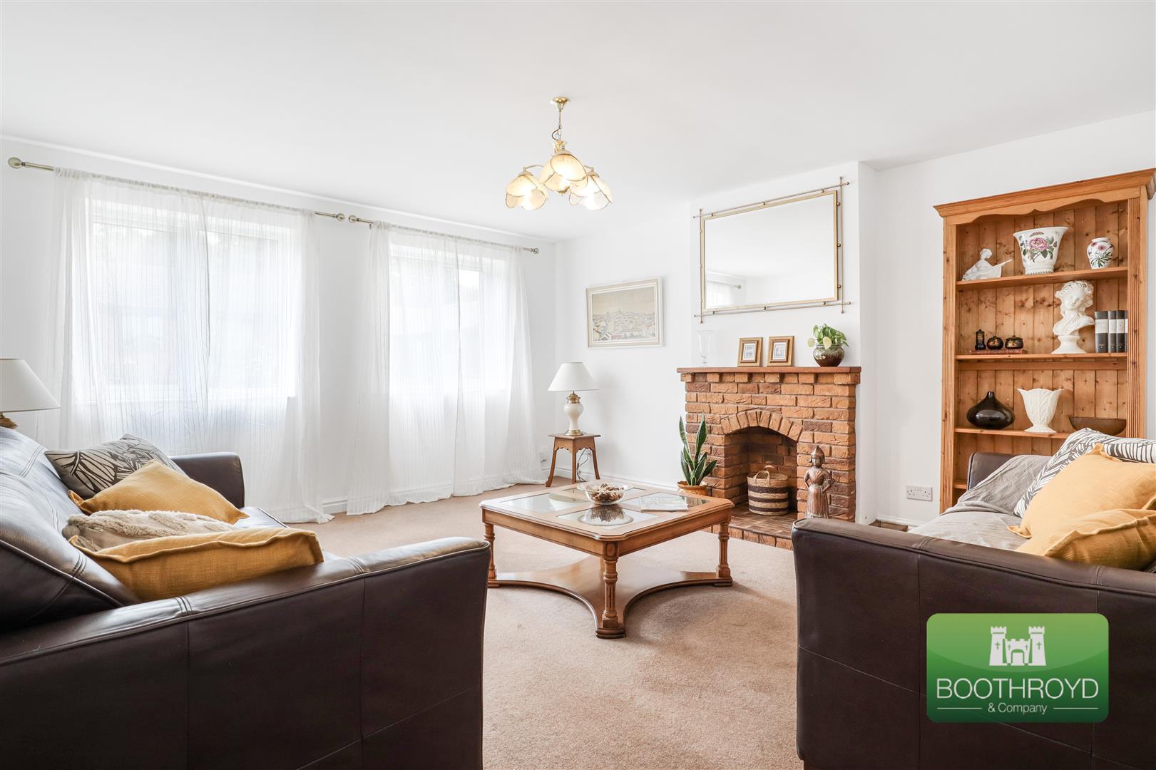 With two windows to the fore, radiator and a brick fireplace with a tiled hearth and wood mantel.