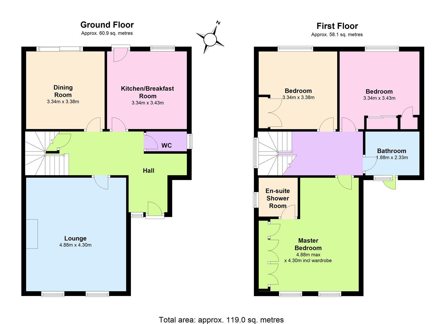 With twin windows to the fore, radiator and built in wardrobes to one wall and a door into the en-suite shower room.