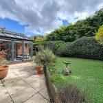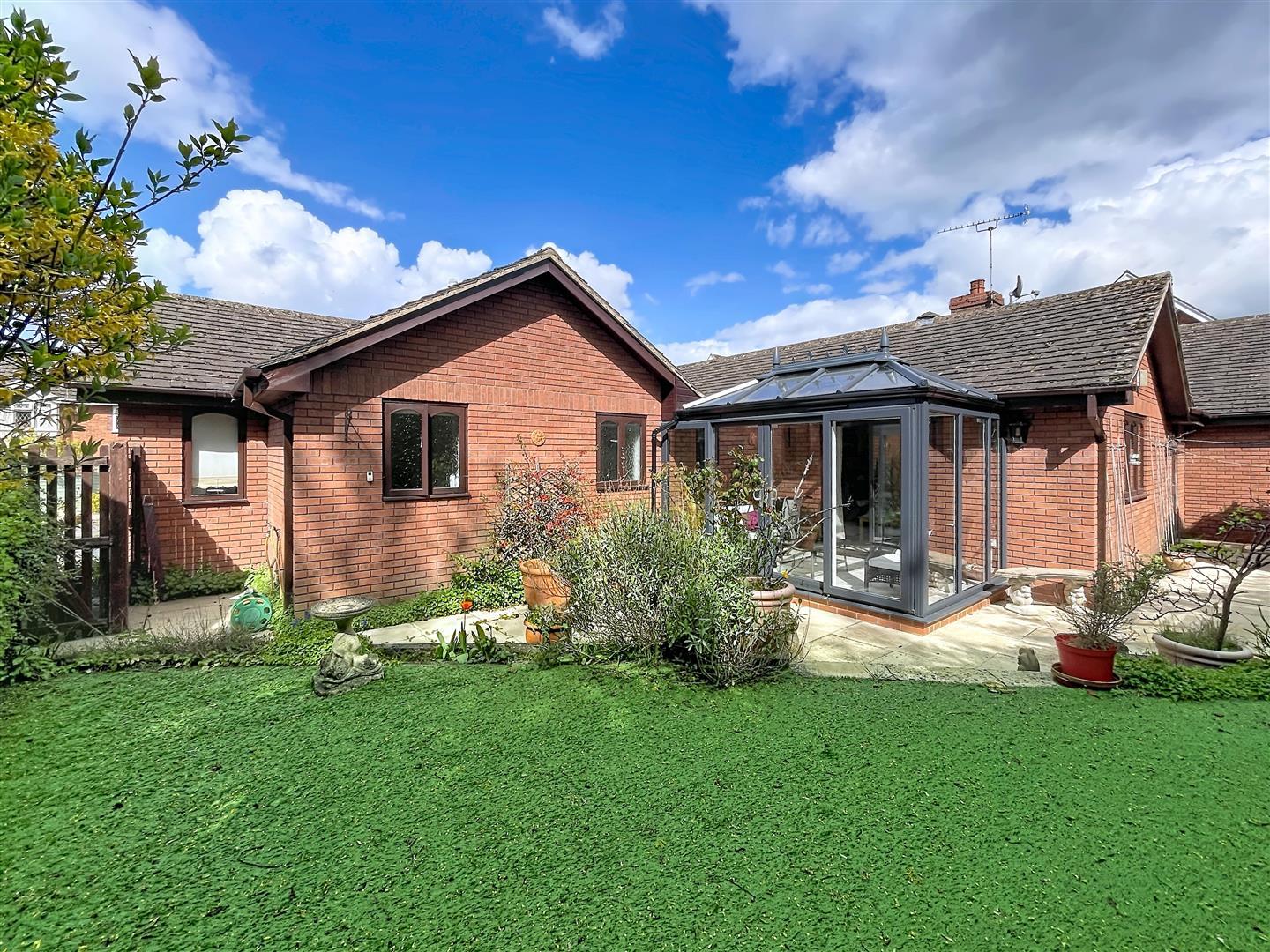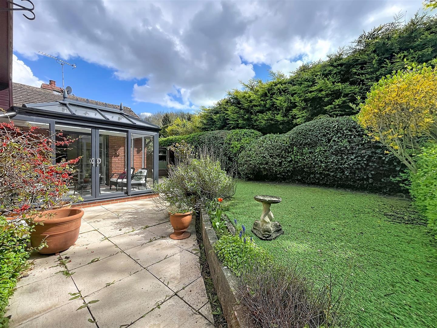 The property is fully enclosed by perimeter fencing and is not overlooked. It features a full-width patio with three steps leading to a raised area with artificial turf, a large shed, a workshop, useful side gated access, and a pedestrian door into the garage. There is also a footpath connecting Frythe Close to Kenilworth Golf Course.