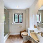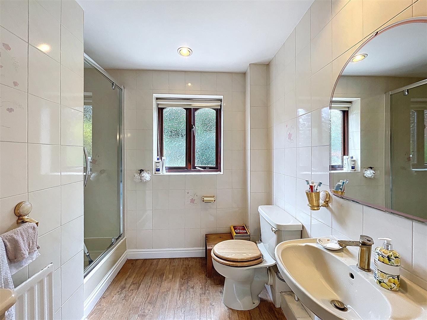 With a three piece champagne coloured suite with low level w.c, pedestal wash hand basin, walk in shower enclosure with mains fed shower, ceramic tiling to walls, vinyl floor, opaque double glazed window to rear, radiator, downlighters.