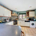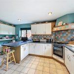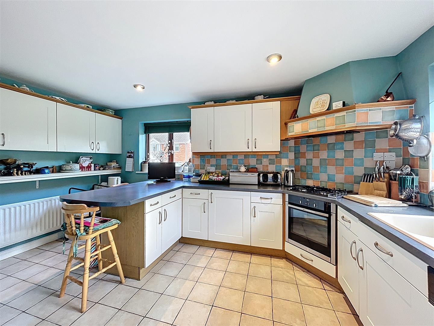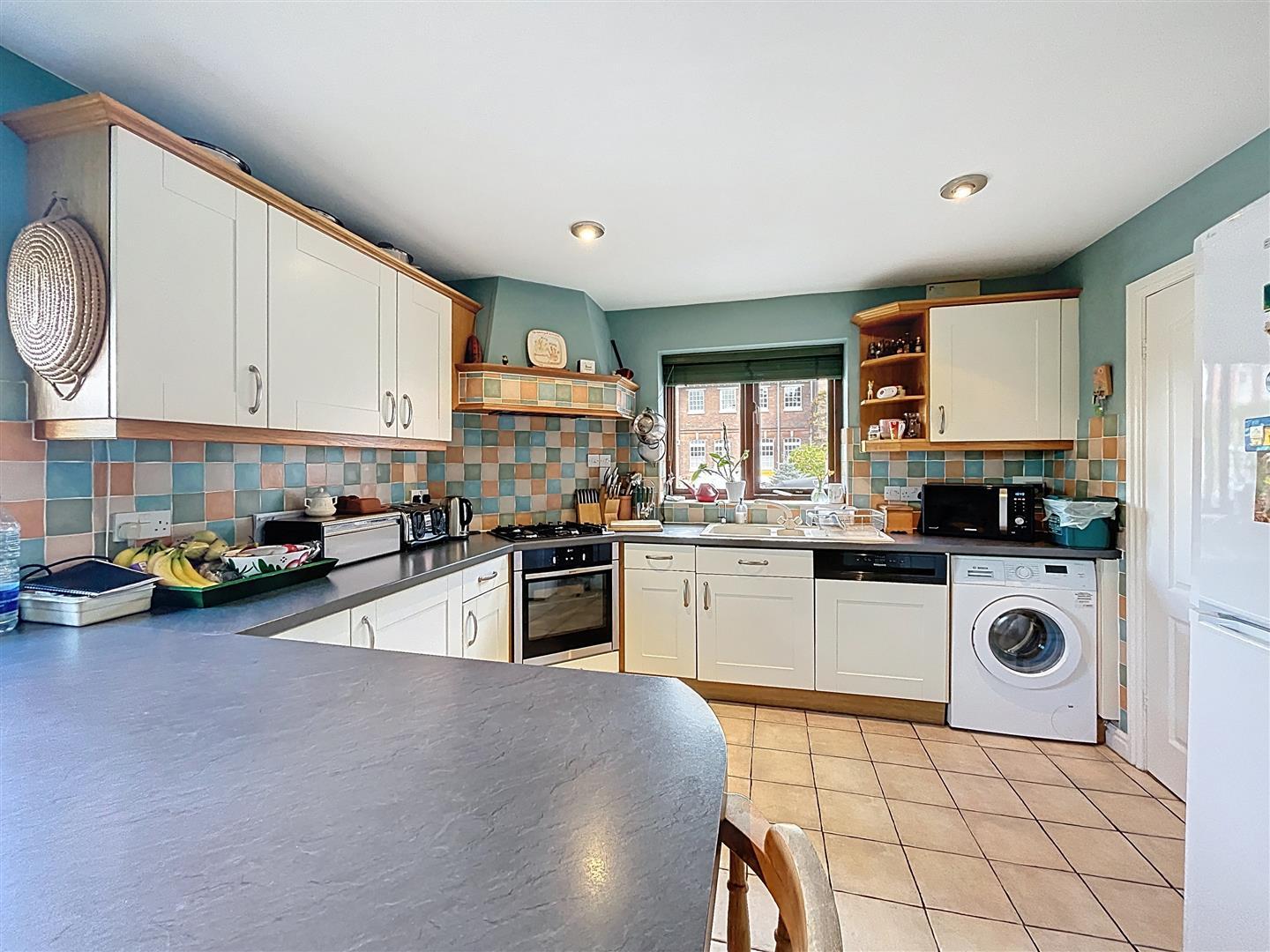 Comprehensively fitted with a range of matching cream shaker style base and wall units with marble effect rounded edge work surfaces with peninsular breakfast bar with two stools, integrated under counter fan assisted oven and grill with four ring gas hob and illuminated inglenook style concealed extractor hood above, under counter fridge, integrated dishwasher, space and plumbing for washing machine, space for large upright fridge freeze, windows to side and front, ceramic tiling to floor radiator, ceiling downlights, one and a half bowl composite sink with mixer tap.