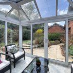 Attractive conservatory with a terrace, grey powder coating, glazed lantern, and double doors leading onto the patio.