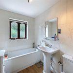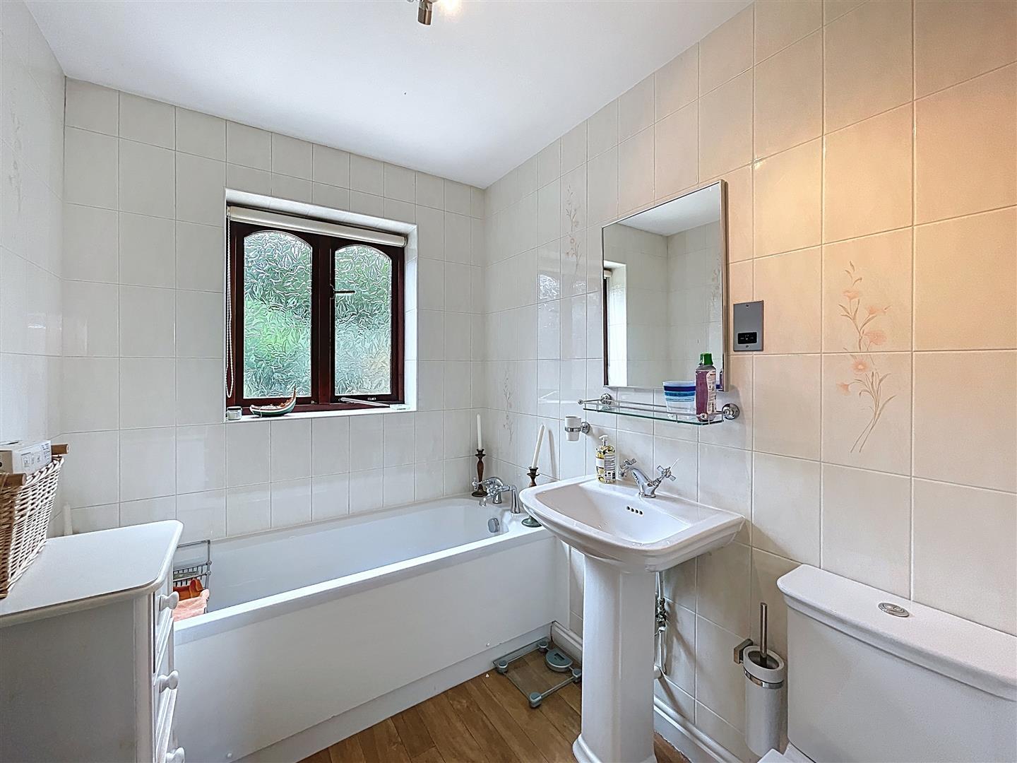 Featuring a three-piece white suite, including a low-level W.C., pedestal wash hand basin, and panelled bath with a chrome mixer tap. The walls are ceramic tiled, and the floor is vinyl. There is an opaque double-glazed window to the rear, a radiator, and a ceiling light.
