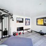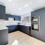 The kitchen is comprehensively fitted with a range of slate grey, handleless wall and base units, complemented by an Onyx worktop with matching upstands. An inset induction hob is set within the work surface, along with a sink unit and Quooker tap. Integrated appliances include a fridge freezer, dishwasher, and eye-level twin ovens. The room is finished with laminate flooring and ceiling downlighters, while windows overlook the rear garden.