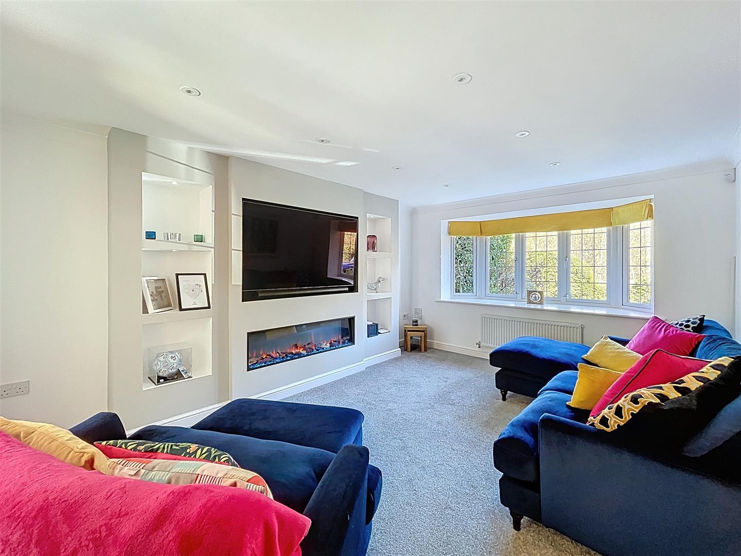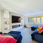 Bow window to the fore with a radiator beneath. Double doors lead through to the dining room. The room has a media wall with space for a sunken television set above a feature fire with illuminated alcoves.