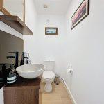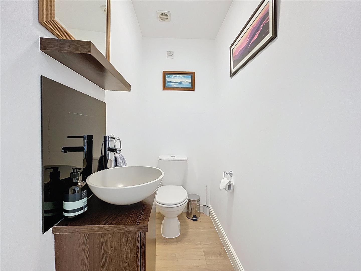 With a close coupled wc and a vanity wash hand basin. Laminate flooring and an extractor fan.