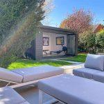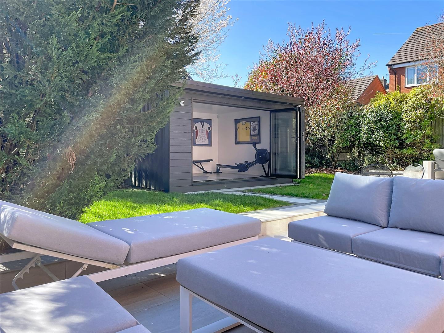 Having an attractive patio that leads dinrectly off the house. A step rises to the formal lawn with shrub borders and a pathway leads to the garden studio.