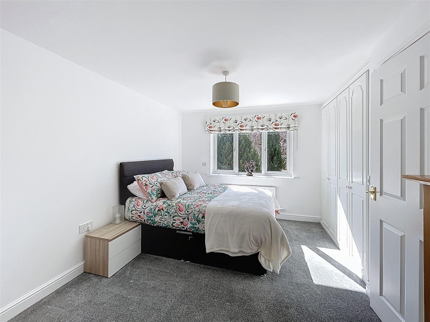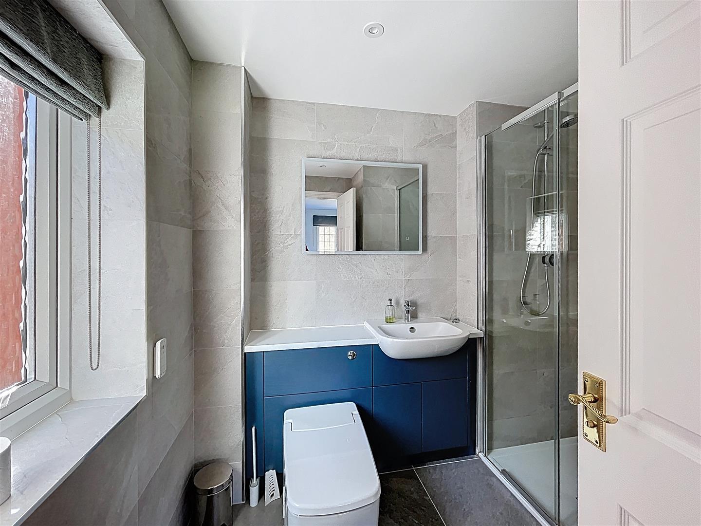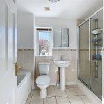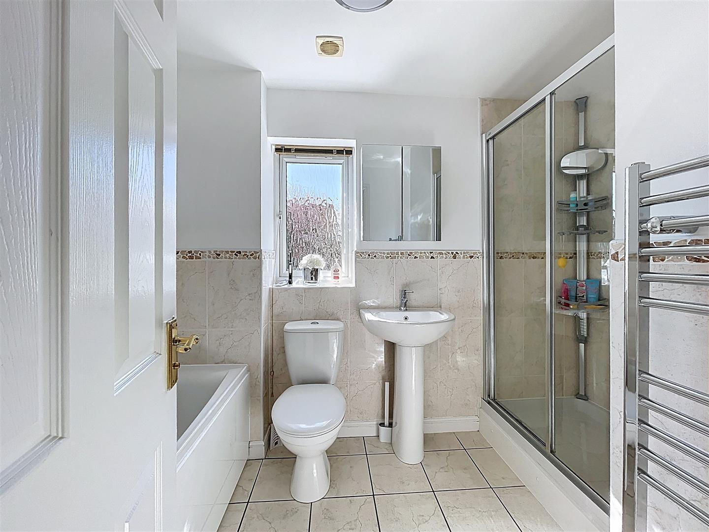 Fitted with a white suite that comprises a panelled bath, pedestal wash hand basin, close coupled wc and a double shower cubicle with thermostatic shower. Heated towel rail, tiled splashbacks and a frosted window to the rear.