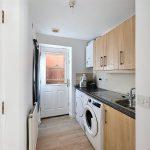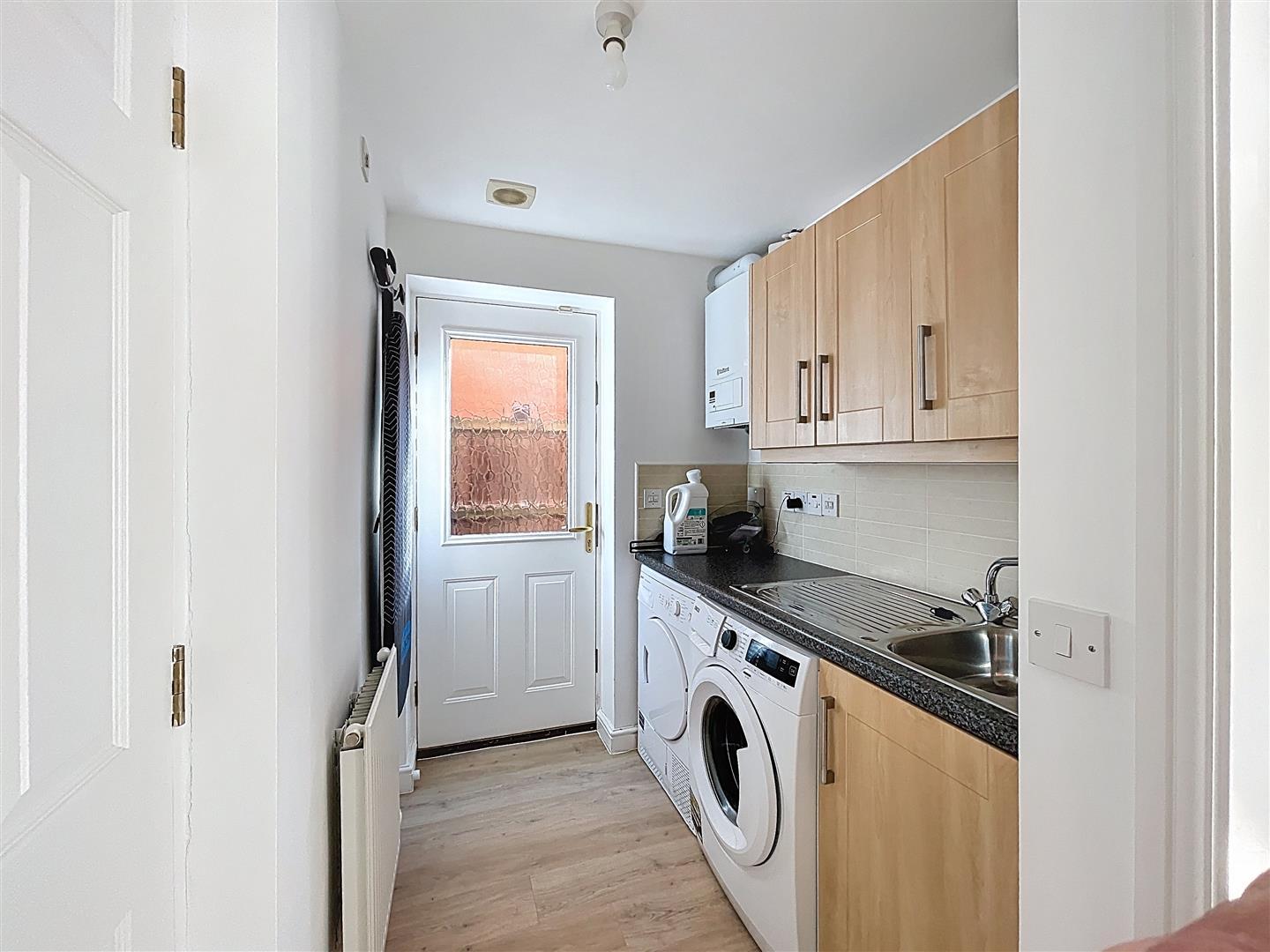 Having shaker style wall and base units, sink unit and plumbing for an automatic washing machine. Radiator, door to the side access and a further door into the integral double garage.