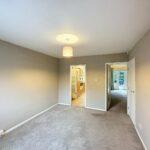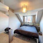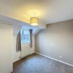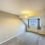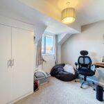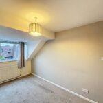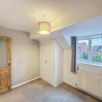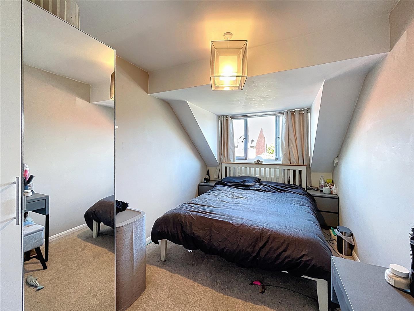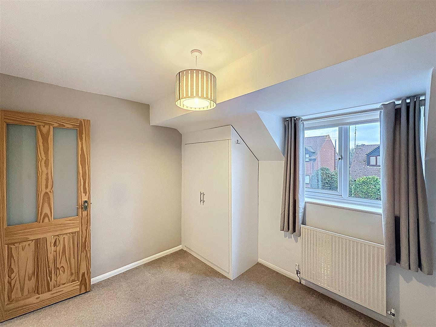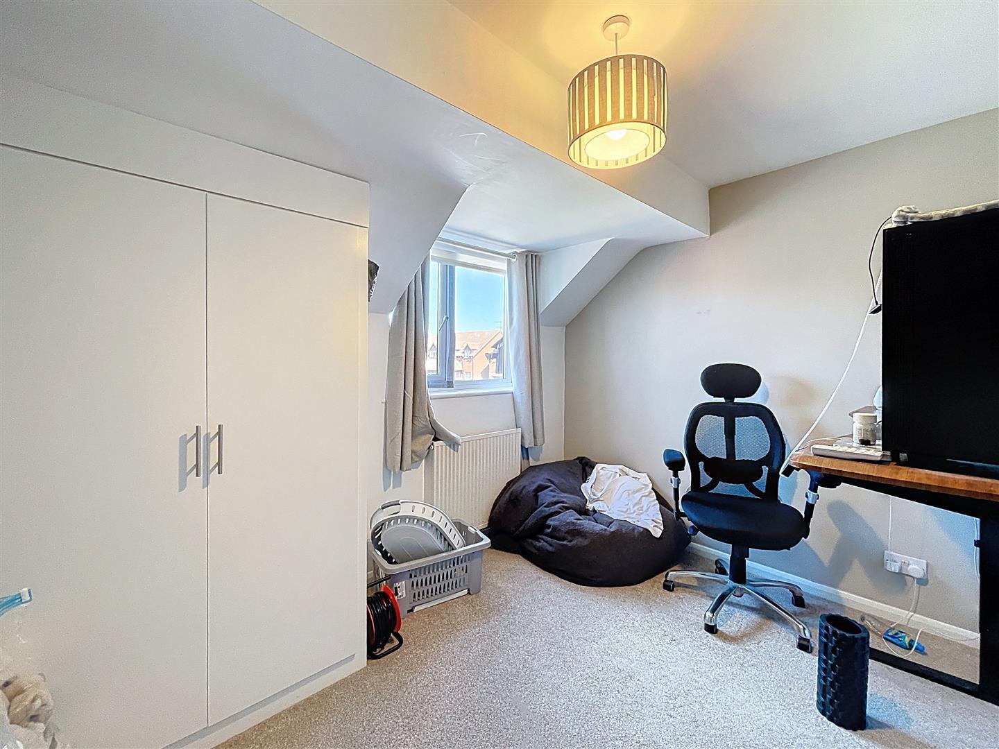 Front-facing double bedroom with a bank of fitted wardrobes with shelving and hanging rail, radiator and central light fitting.