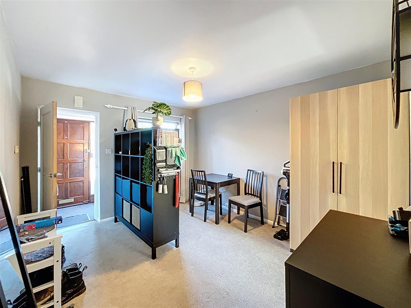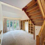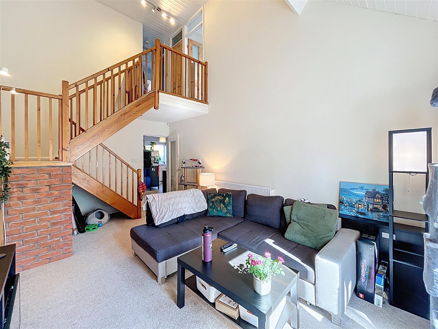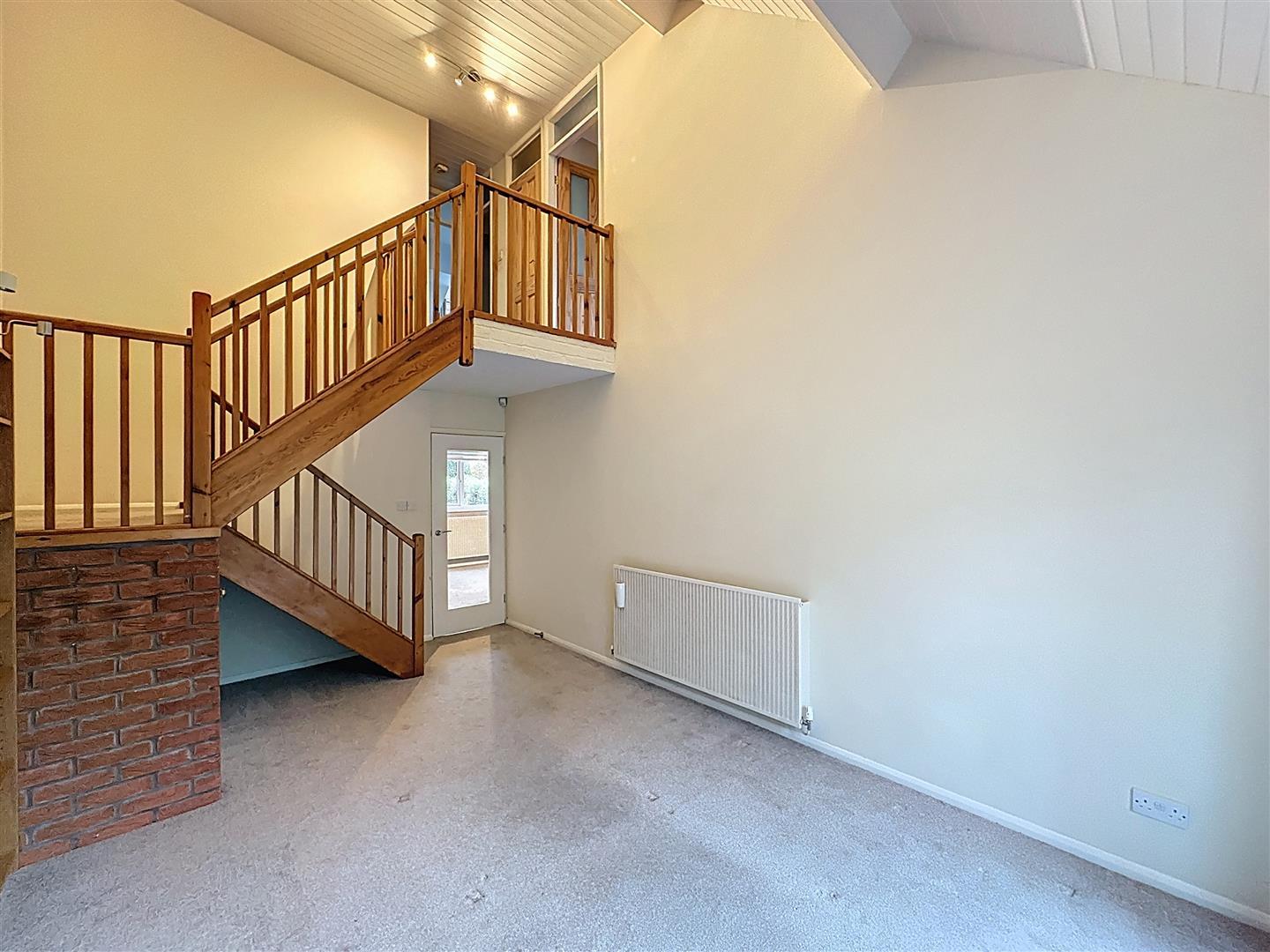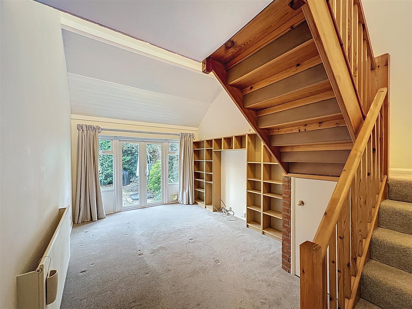 Vaulted ceiling with patio doors opening onto the south-facing rear courtyard garden, fitted shelving with lighting, dogleg staircase to the first-floor landing with useful understairs storage.