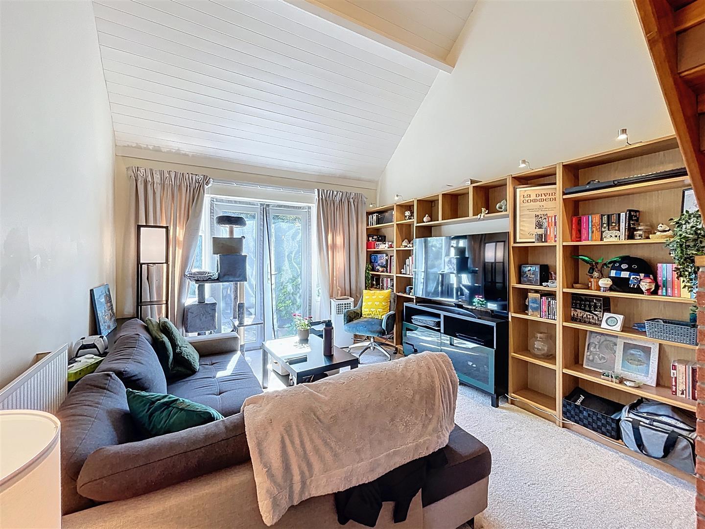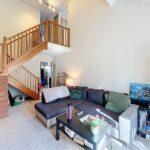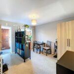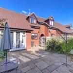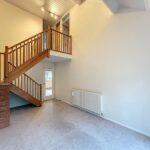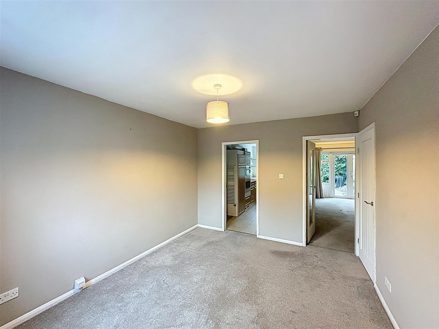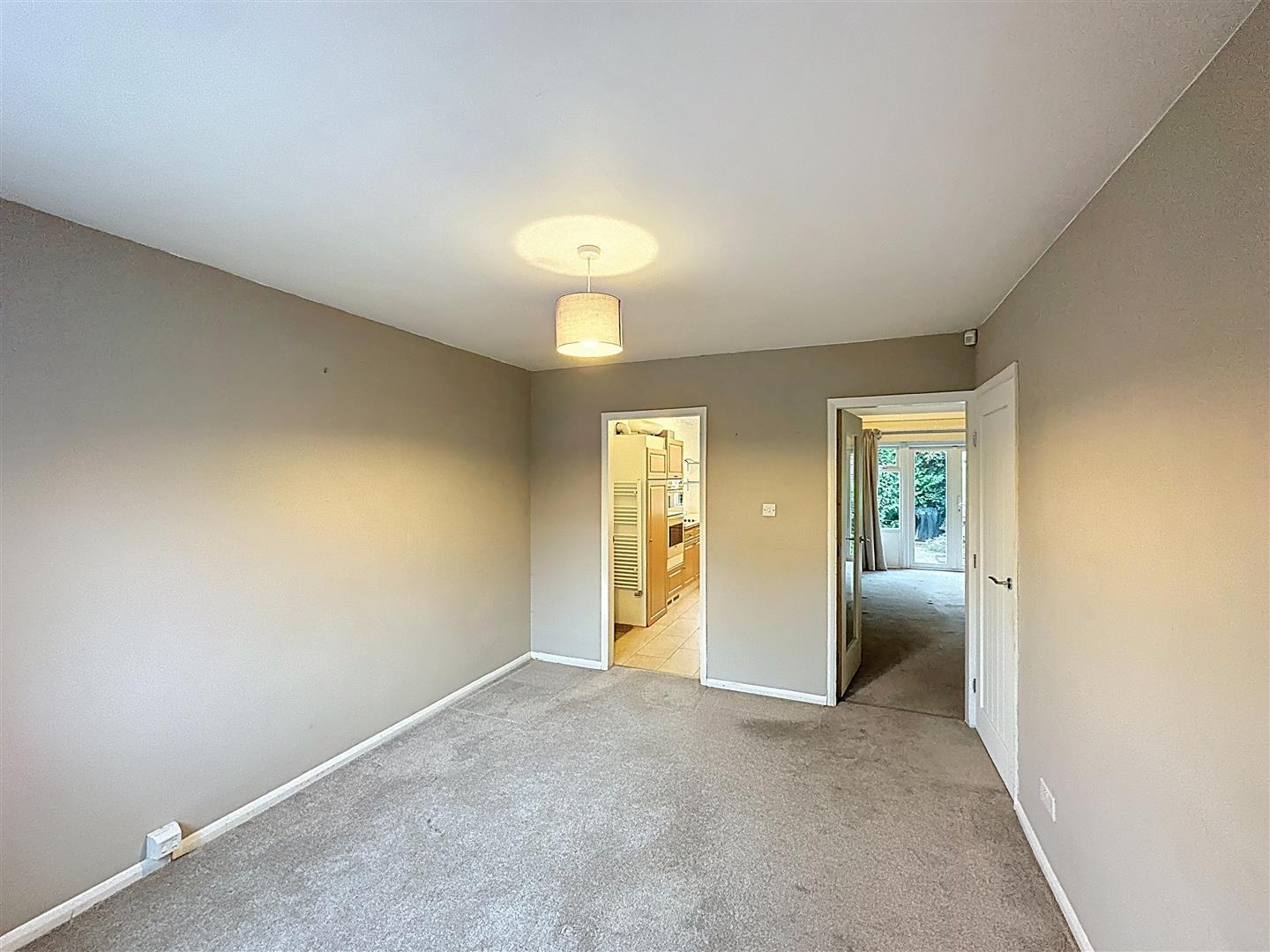 Vaulted ceiling with patio doors opening onto the south-facing rear courtyard garden, fitted shelving with lighting, dogleg staircase to the first-floor landing with useful understairs storage.