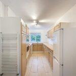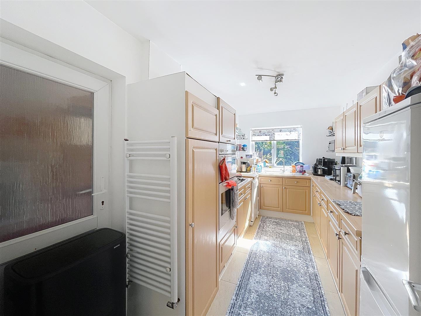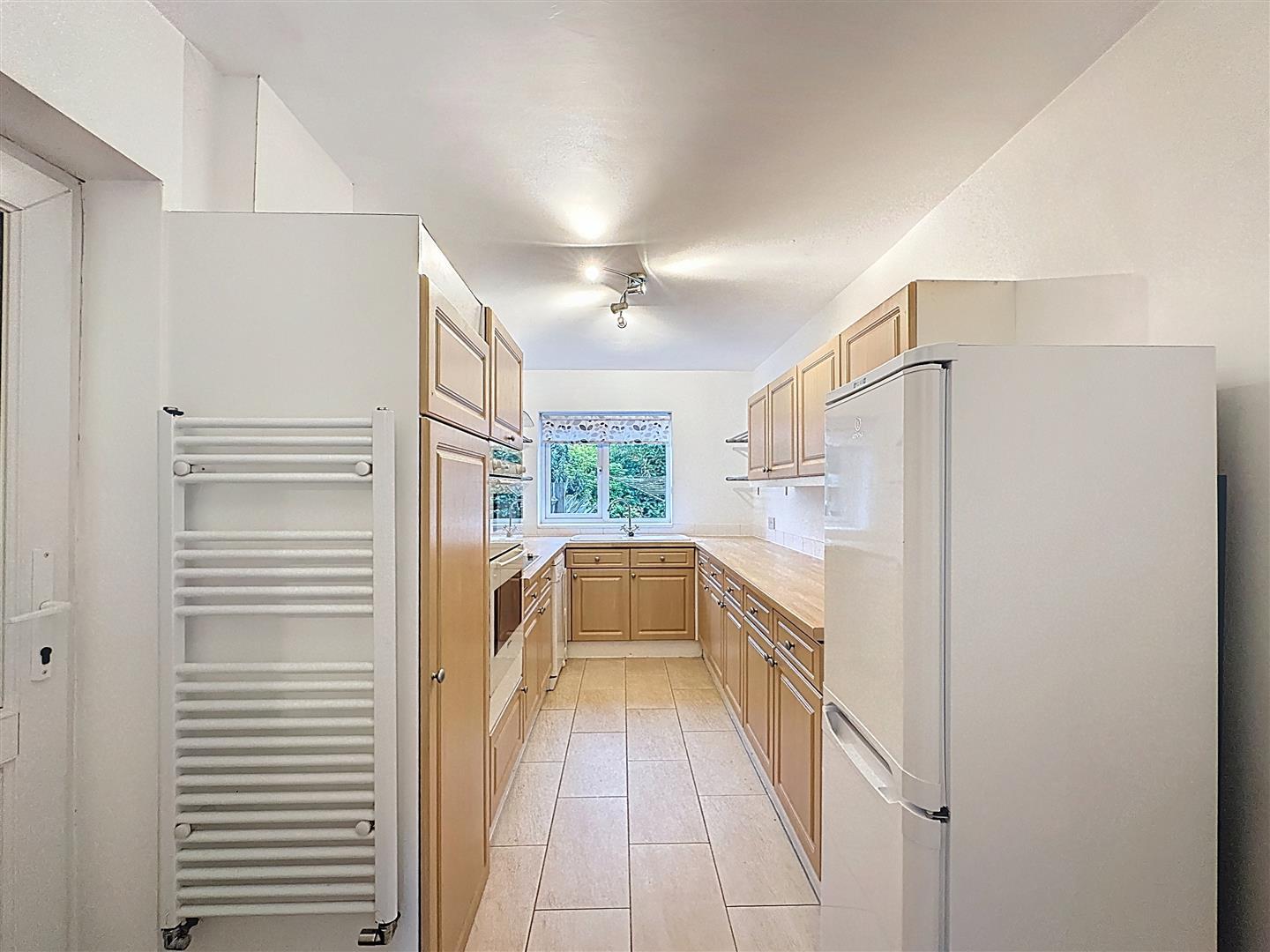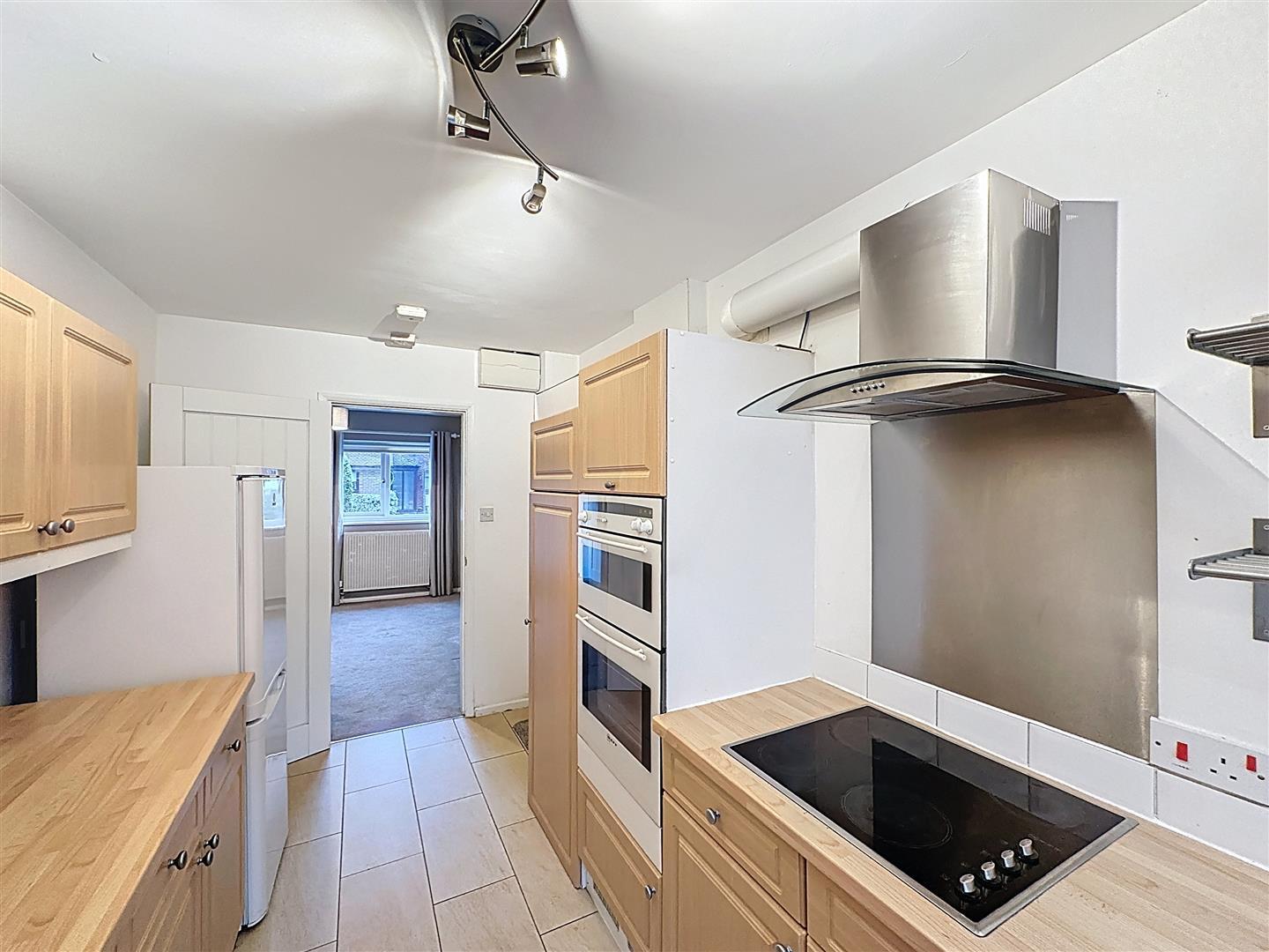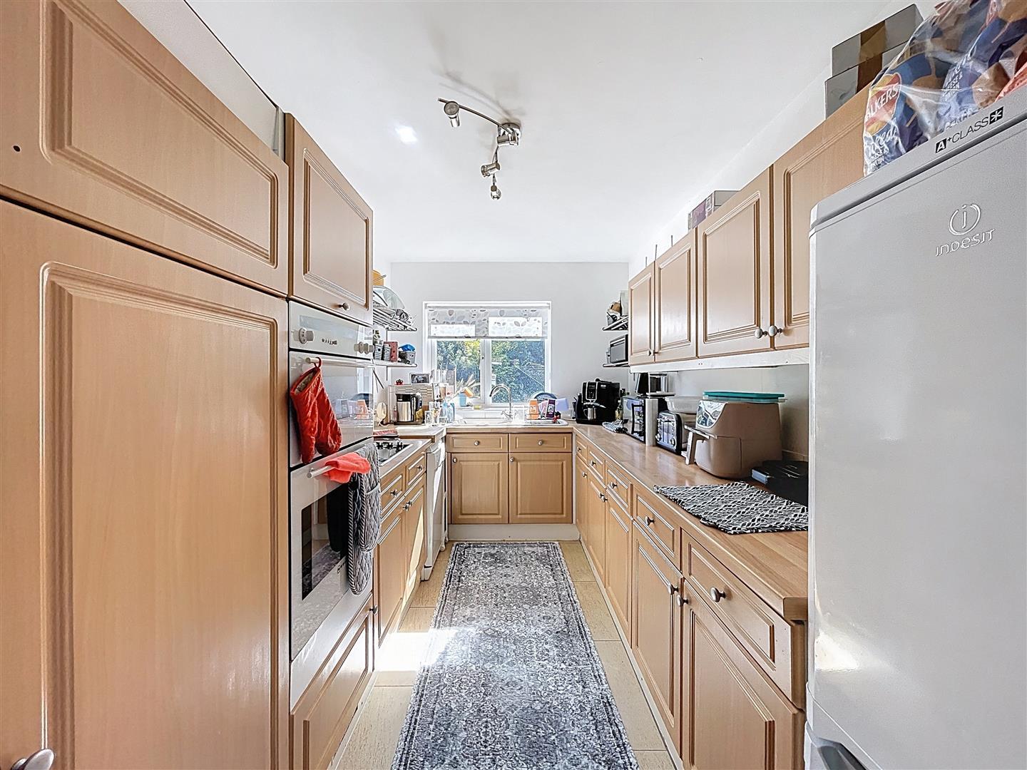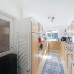 A well-planned galley kitchen fitted with a range of shaker-style wall and base units with a wood block rollover worktop. Appliances include a Neff double oven and grill, electric hob with stainless steel splashback, composite sink and drainer with mixer tap overlooking rear south-facing garden with an opaque glazed side door. There is space for a fridge/freezer and dishwasher. Housed in a cupboard is the Valiant boiler.