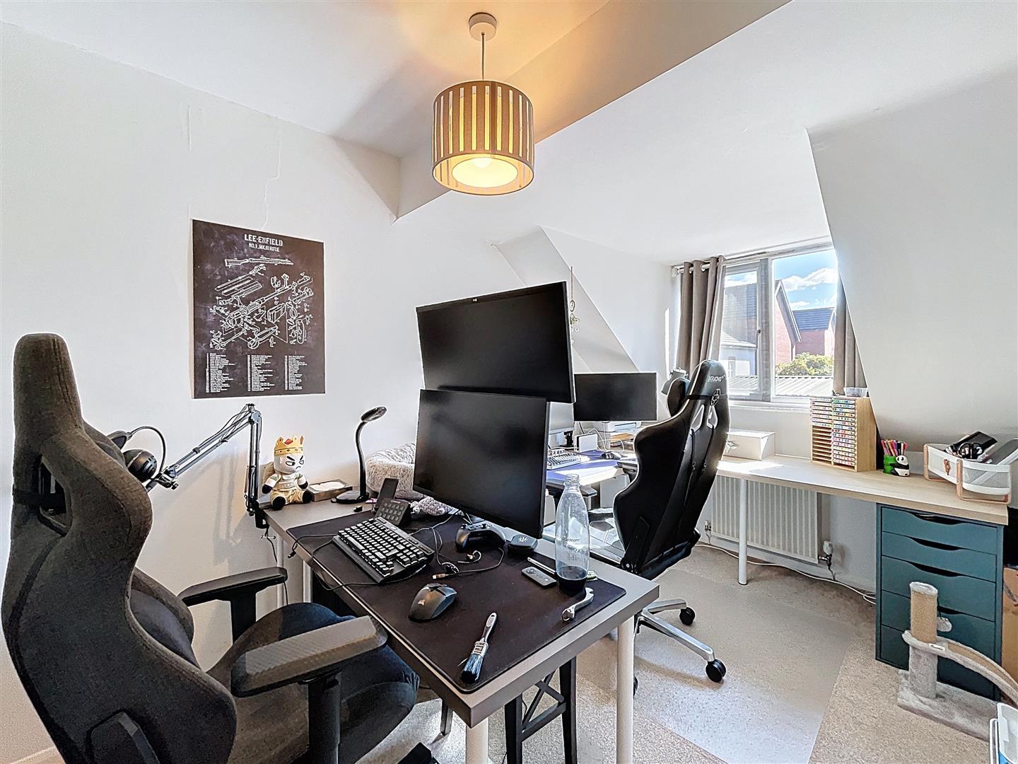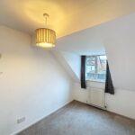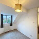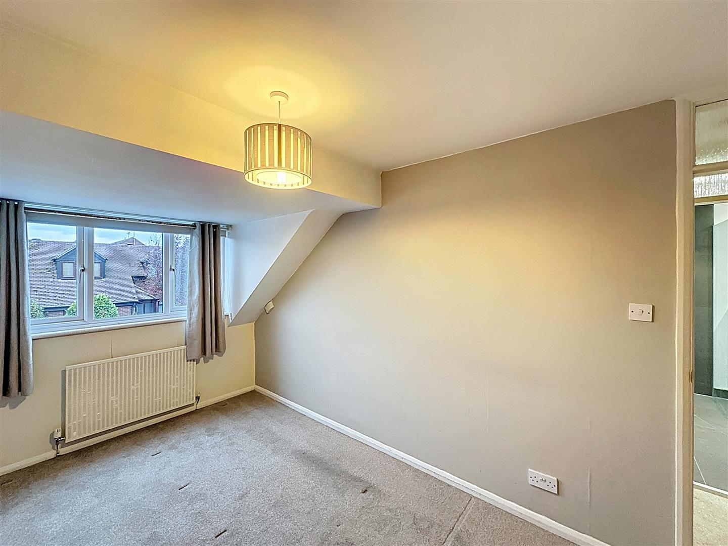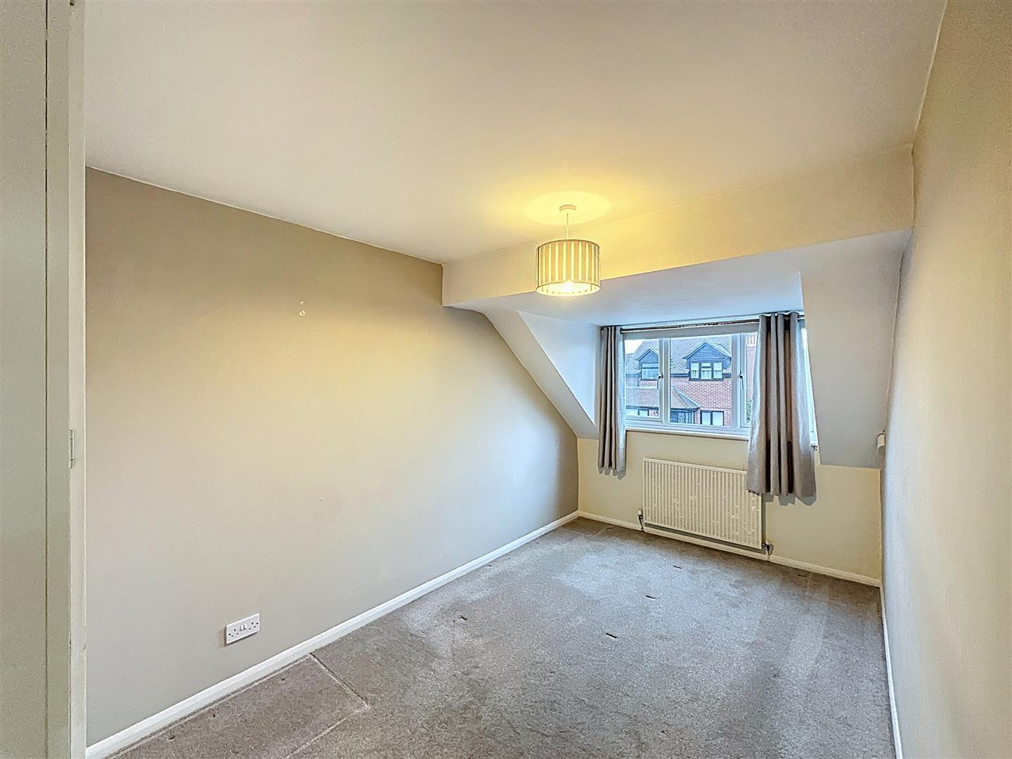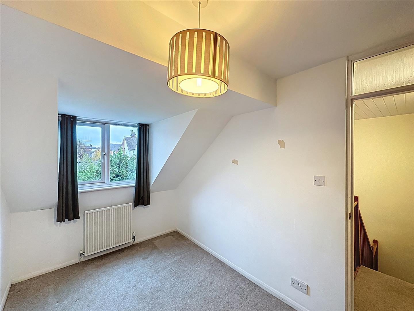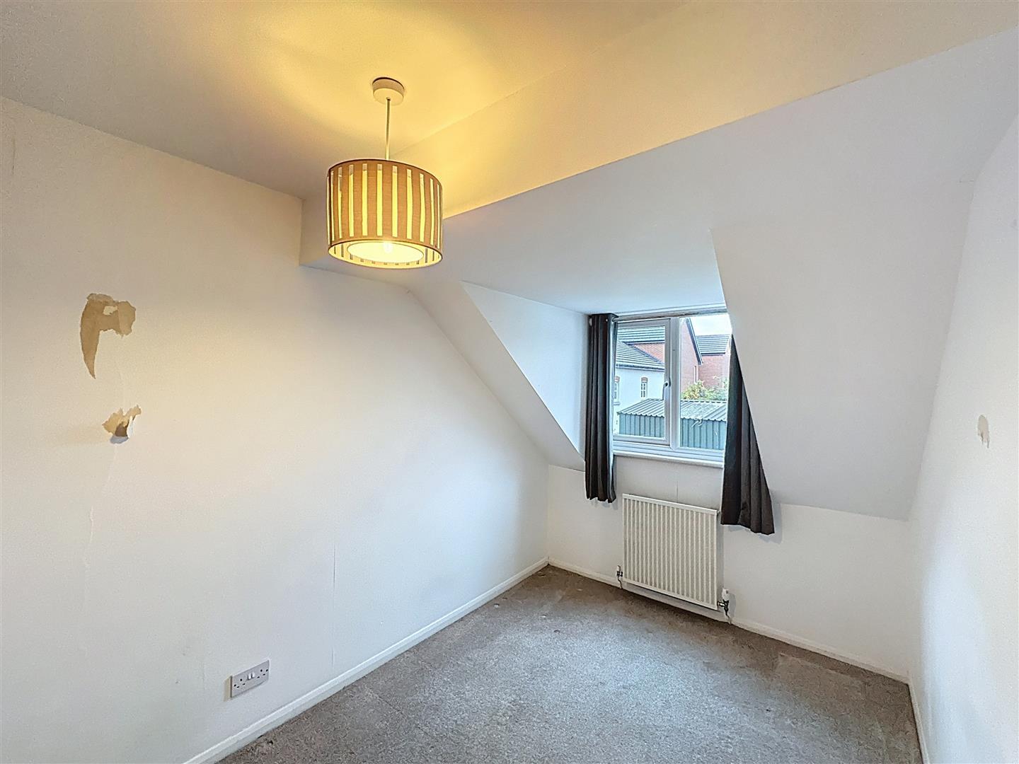 Rear-facing bedroom with radiator and central ceiling light.