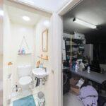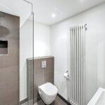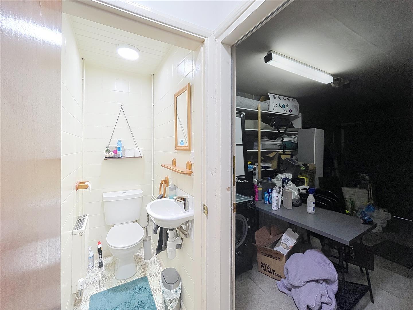 Comprising a wash hand basin with chrome mixer tap, low level WC with full-height ceramic tiling, central ceiling light, extractor and radiator.