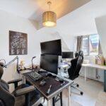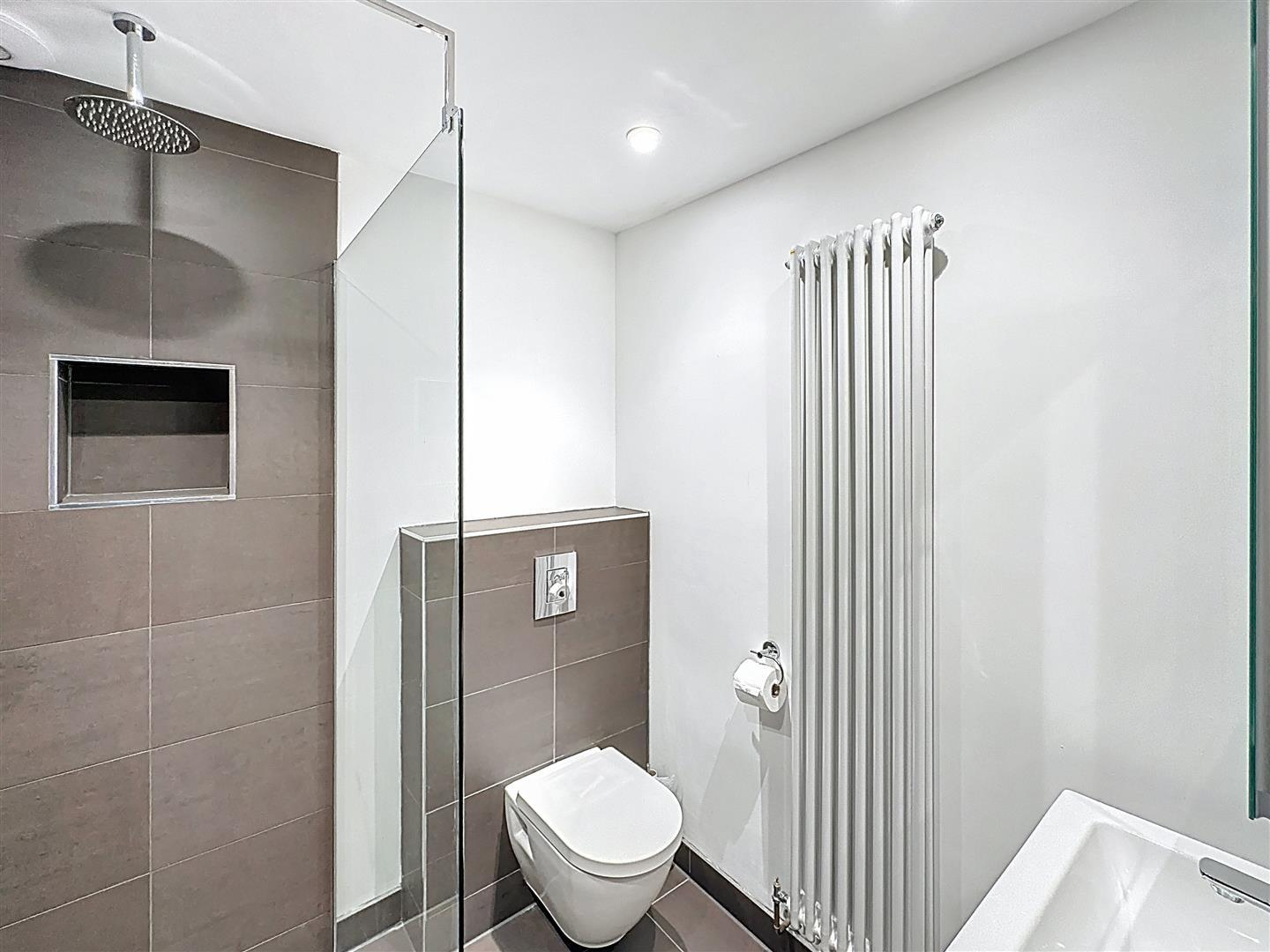 Beautifully appointed with underfloor heating, LED downlighters, vertical radiator and a walk-in mains-fed shower with full height ceramic tiling and flooring, glass screen with inset shelving. Fitted vanity unit with drawer storage and illuminated mirror with shaving point and concealed cistern WC.
