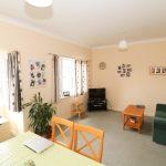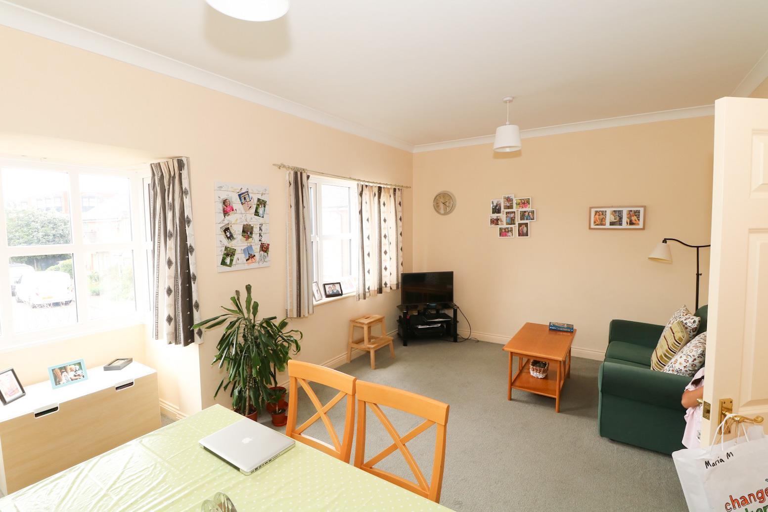 Double glazed window and further bay window to the fore with curtains, double and single radiators, coving to ceiling and a two seater sofa, coffee table, wicker chair, four seater dining table and bookcase.