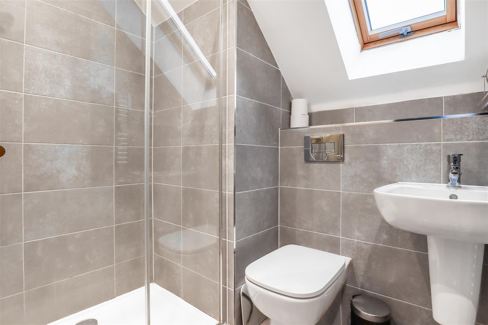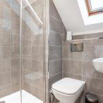 The bathroom features a three-piece white suite, which includes a low-level WC, a half pedestal wall-hung wash hand basin with a chrome mixer tap, and a walk-in shower enclosure equipped with a mains-fed shower and a sliding shower screen. The walls are decorated with porcelain tiles, complemented with a heated chrome towel rail, and additionally with a Velux window facing the rear.