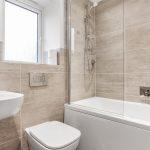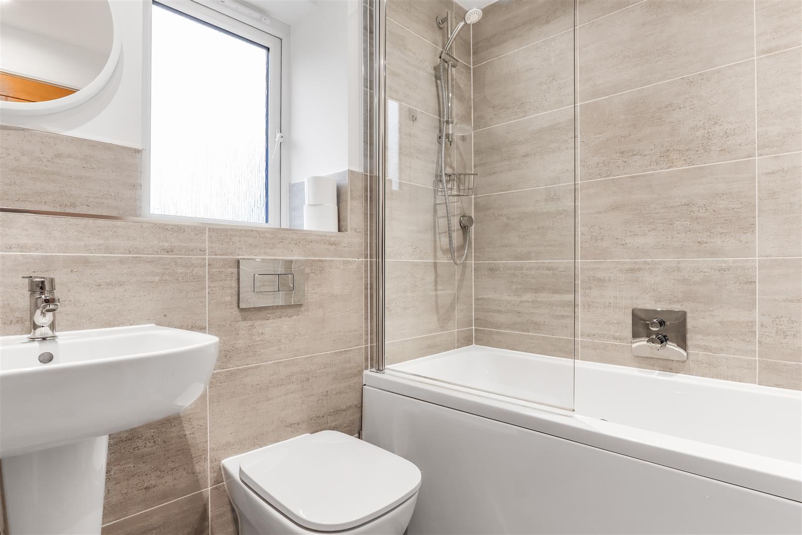The bathroom includes a three-piece white suite, which consists of a low-level WC, a wall-hung half pedestal wash basin with a chrome mixer tap, and a panelled bathtub fitted with wall-mounted chrome mixer taps. Additionally, there is a mains-fed shower featuring a fitted glazed shower screen. Other amenities comprise an opaque window on the side, an extractor fan, and LED downlighters for improved lighting.
