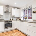 The kitchen area is fully equipped with a range of matching white high-gloss, handleless base and wall units, complemented by marble-effect rounded-edge work surfaces. A one-and-a-half bowl stainless steel sink with a chrome mixer tap sits beneath a window overlooking the rear. Integrated appliances include a Hotpoint undercounter fan-assisted oven and grill, a four-ring induction hob with an illuminated stainless steel extractor hood above, an Indesit washing machine, a fridge freezer, and a dishwasher. The space benefits from LED downlighters, a feature drop-down ceiling light, a radiator, and Karndean flooring throughout. The kitchen opens out via French doors leading onto the patio.