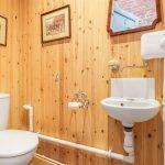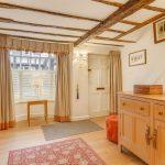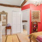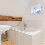 Through a folding door, you find a heated chrome towel rail, paneled bath with tiled splashback, exposed timber beams with awning window overlooking the abbey fields, low level WC with pedestal wash hand basin with mixer tap