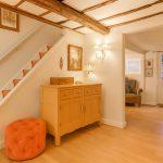 Stairs rising to reveal the top floor with exposed beams, radiator, array of storage cupboards, plantation shutters to the front window.