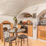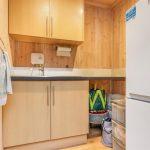 Cantilever style stairs with central steel backbone and timber handrail leads you down into the old bakery kitchen, set beneath a brick barrel ceiling with arched recesses from the old bakery kilns. With timber shaker style base units with fitted drawers, straight edged quartz worktop with double Belfast sink set below a lunette window, A built in electric fan Delonghi oven with four ring gas stove and illuminated extractor above, integrated fridge, radiators, bespoke cupboard doors allow space saving storage that houses the washing machine and dryer allowing space for small table and chairs.