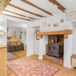 With Amtico flooring underfoot and exposed timber beams above, natural light through a Bow window with complimentary plantation shutters highlighting the feature living flame gas fireplace within a brick recess with oak mantel and stone tiled hearth. Alcoves either side with one side having a wall-mounted coat rack with space-saving storage over head. Stairs rising to first floor and square arch through to the