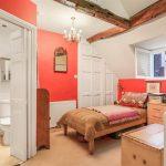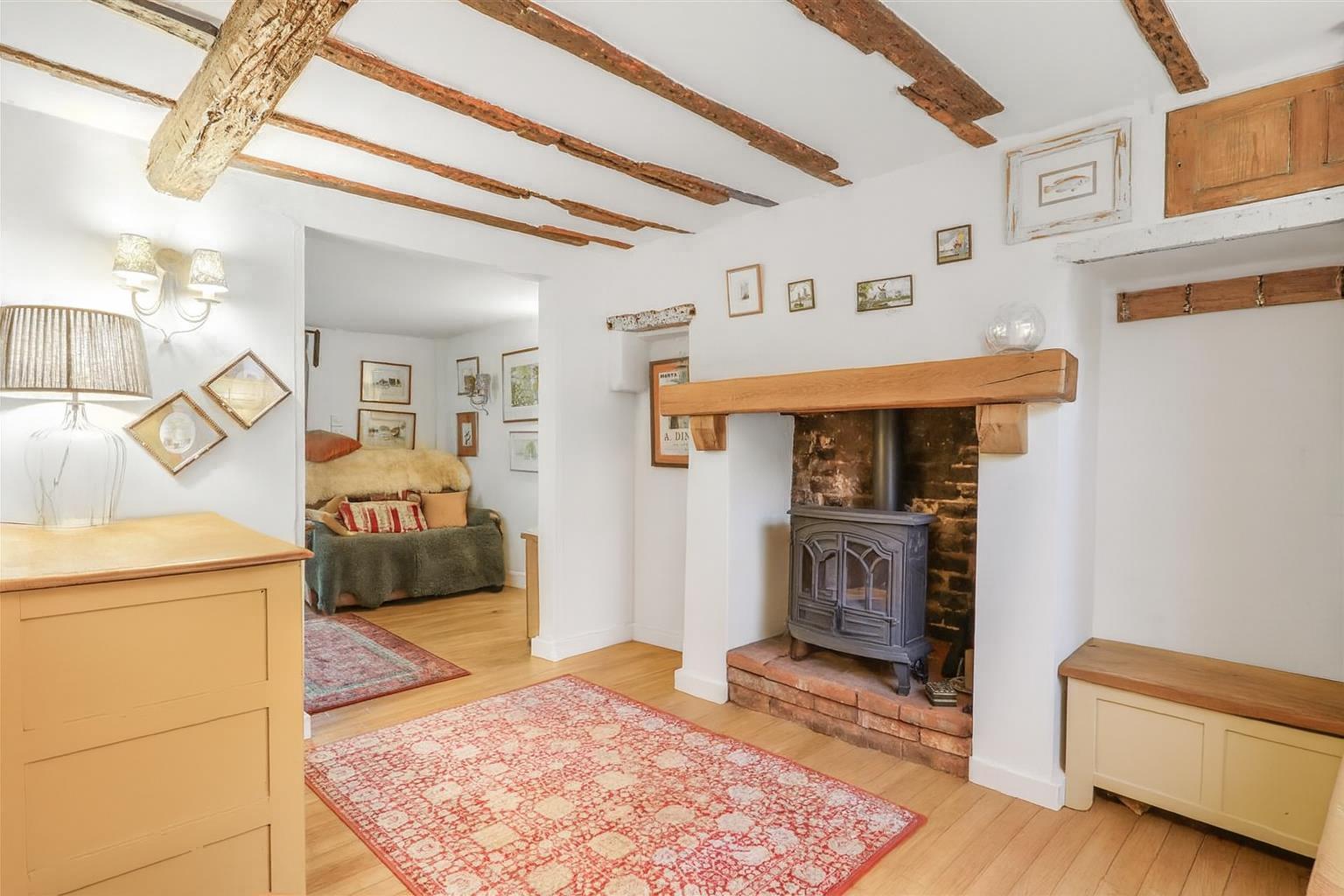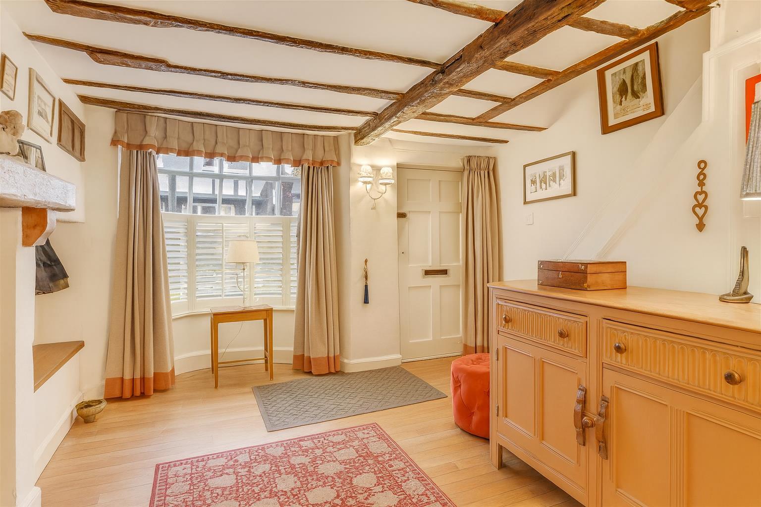 Sash window to the fore with exposed beams above, radiator, wall lights with door to