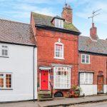 Stone steps up to red paneled door with traditional knocker positioned under a canopy porch, set against classic exposed brickwork with courtesy lighting from a wall mounted lantern.