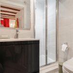Recently refurbished contemporary en-suite with walk in mains fed shower with dual attachments, glass panel screening and extractor above. Floor standing two drawer cabinet wash hand basin with mixer chrome tap and mirror above with full height tile splashback, chrome towel radiator, LED spotlights, low level wc with further in-built storage cupboard.