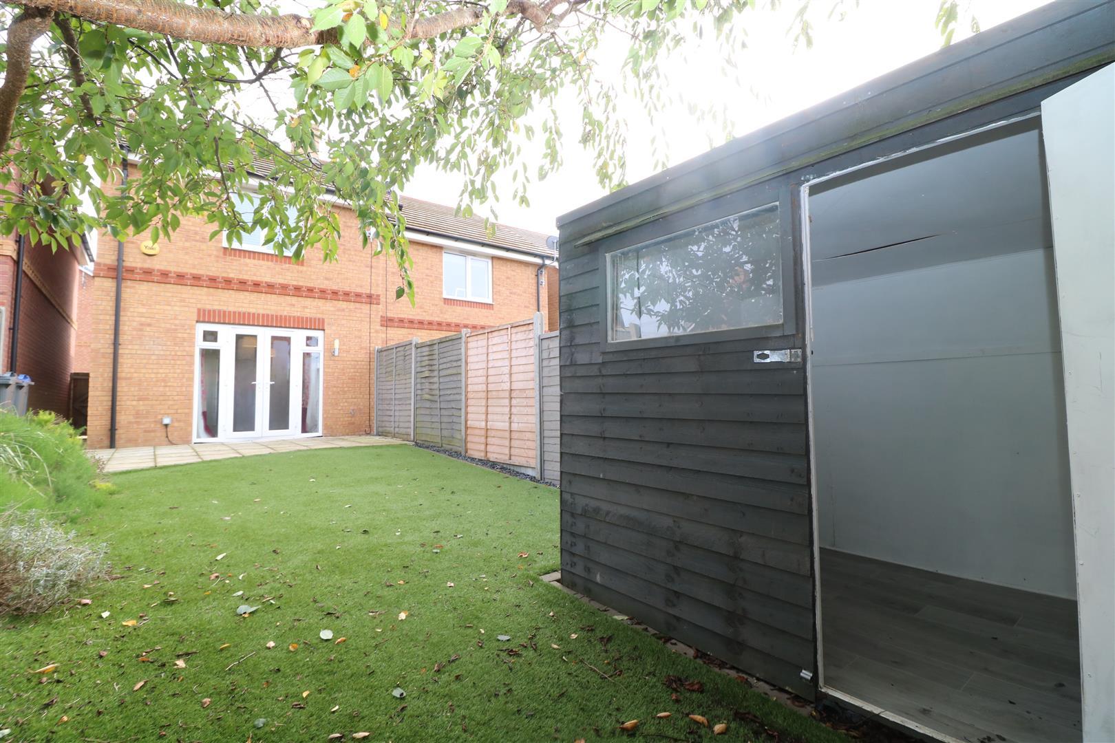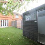 The enclosed rear garden has a paved patio area that leads from the French doors with the remainder mostly laid with artificial lawn with Slate border. Side access to the front of the property. There is also a timber frame shed with power and lighting.